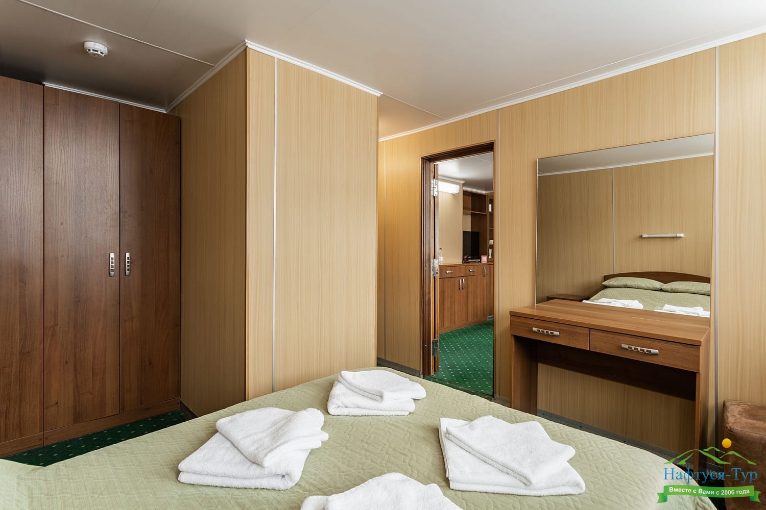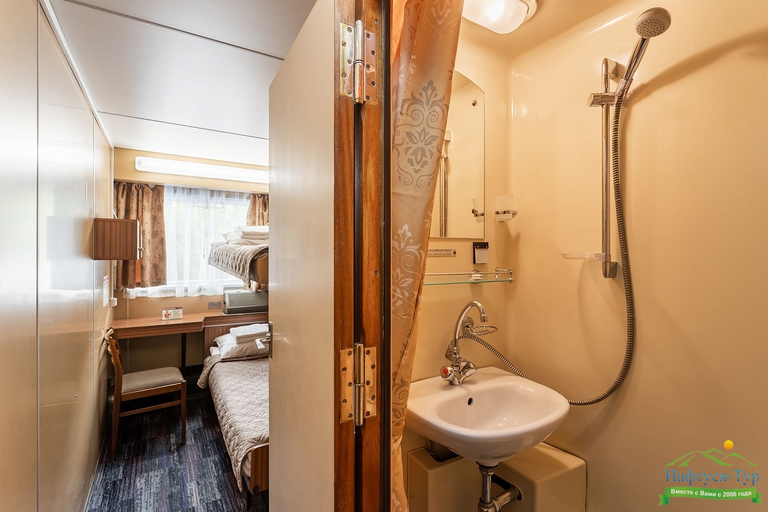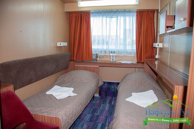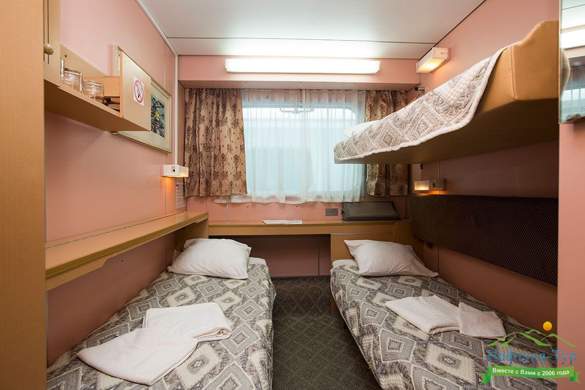 В каюте: четыре спальных места (два внизу, два вторым ярусом), шкаф для одежды, радио, душ, 2 санузла, холодильник, кондиционер, два обзорных окна, электророзетка 220V.