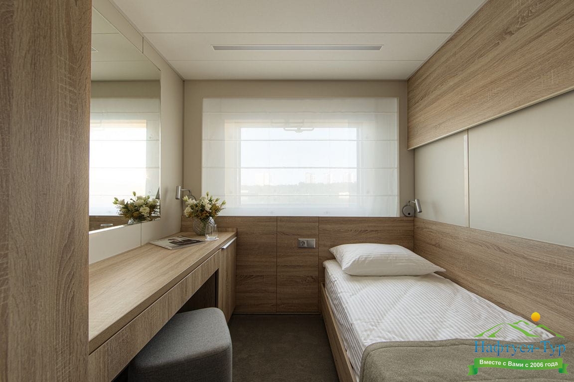 В каюте: одно спальное место, шкаф для одежды, радио, кондиционер, душ, санузел, холодильник, телевизор, фен, обзорное окно, электророзетка на 220V, площадь каюты до 7,7 м2.