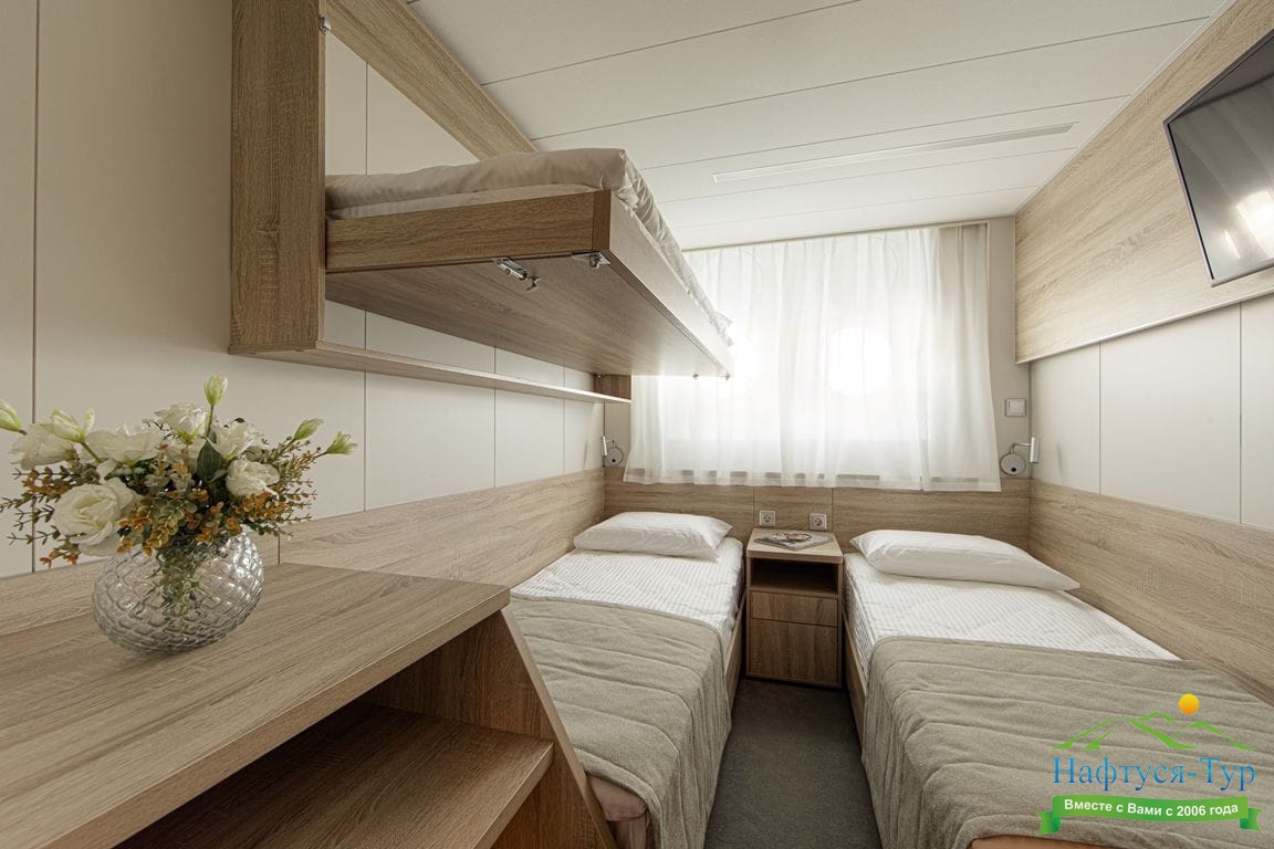 В каюте: два спальных места (не сдвигаются), шкаф для одежды, радио, кондиционер, душ, санузел, холодильник, телевизор, фен, обзорное окно, электророзетка на 220V, площадь кают до 9,1 м2.