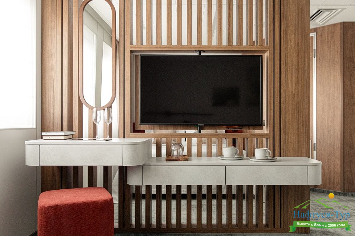 Комфортабельная гостиная с современным интерьером, шкаф для одежды, журнальный столик, мягкая мебель, телевизор, холодильник, капсульная кофемашина, фен, радио, два обзорных окна, электророзетка на 220V. В спальне: двуспальная кровать, шкаф для одежды, трюмо, два обзорных окна: