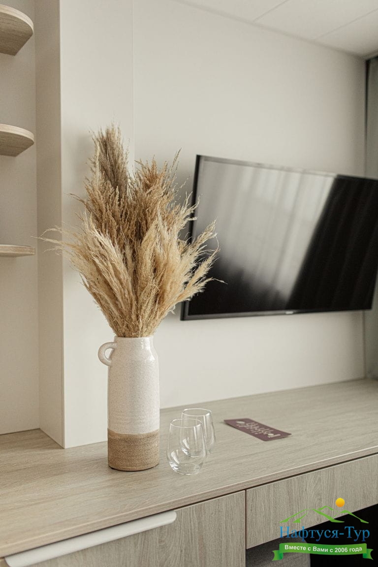 Комфортабельная гостиная с современным интерьером, шкаф для одежды, журнальный столик, мягкая мебель, телевизор, холодильник, капсульная кофемашина, фен, радио, два обзорных окна, электророзетка на 220V. В спальне: двуспальная кровать, шкаф для одежды, трюмо, два обзорных окна.