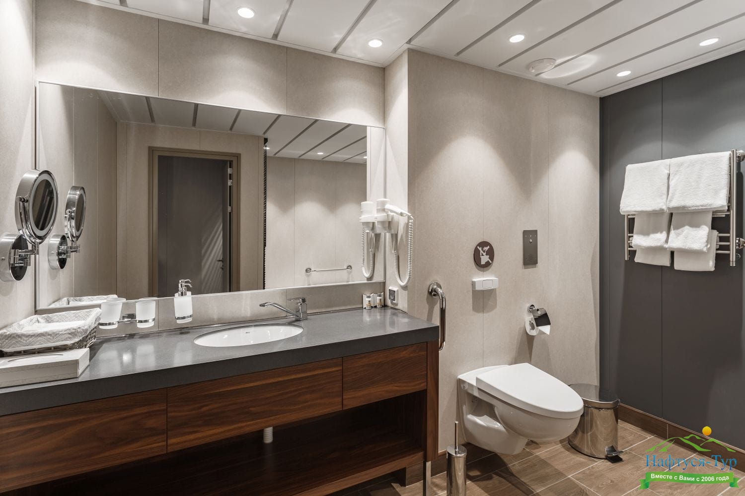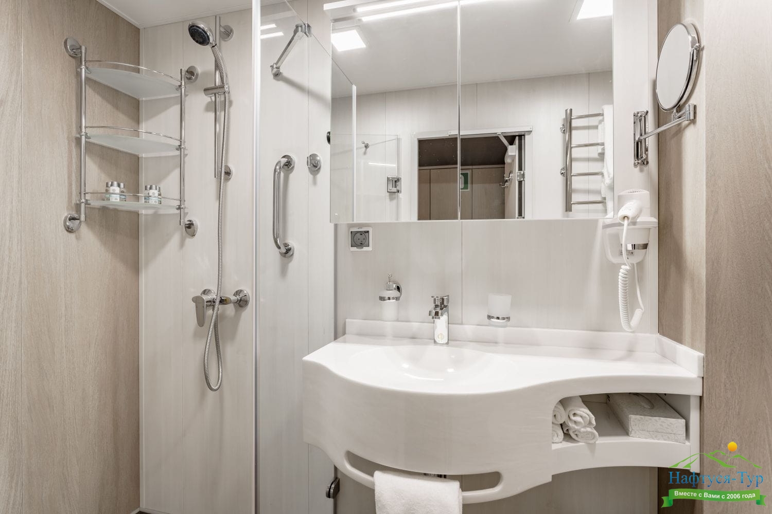 Просторная и комфортабельная каюта на теплоходе с большой, светлой ванной комнатой, балконом и всем необходимым для отдыха