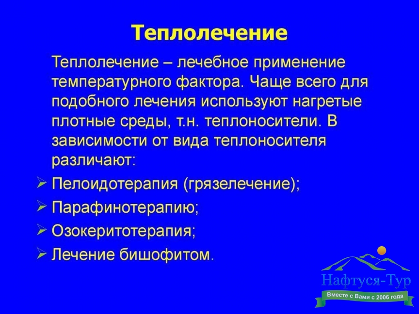 Теплолечение (термотерапия) – широкий перечень методов физиотерапевтического лечения, профилактики и реабилитации, основанный на использовании воздействия на организм нагретыми средами с высокой теплоемкостью и низкой теплопроводностью. В большинстве случаев санатории нашей страны не указывают теплолечение в качестве отдельного пункта своих возможностей. Обычно приводится пространный перечень тех разновидностей метода, которые применяются медиками здравницы. Среди них могут быть: озокеритотерапия, парафинотерапия, бишофитотерапия, нафталанолечение, псаммотерапия и многие другие.При теплолечении производится дозированное (определяется назначениями врача) воздействие тепла на тело пациента, что позволяет усилить циркуляцию крови и лимфы в тканях, ускорить обмен веществ, обеспечивает противовоспалительное действие. Соответственно, наиболее часто данную методику применяют для устранения хронических воспалительных процессов, последствий травм, при заболеваниях костно-мышечной и нервной систем, кожи.