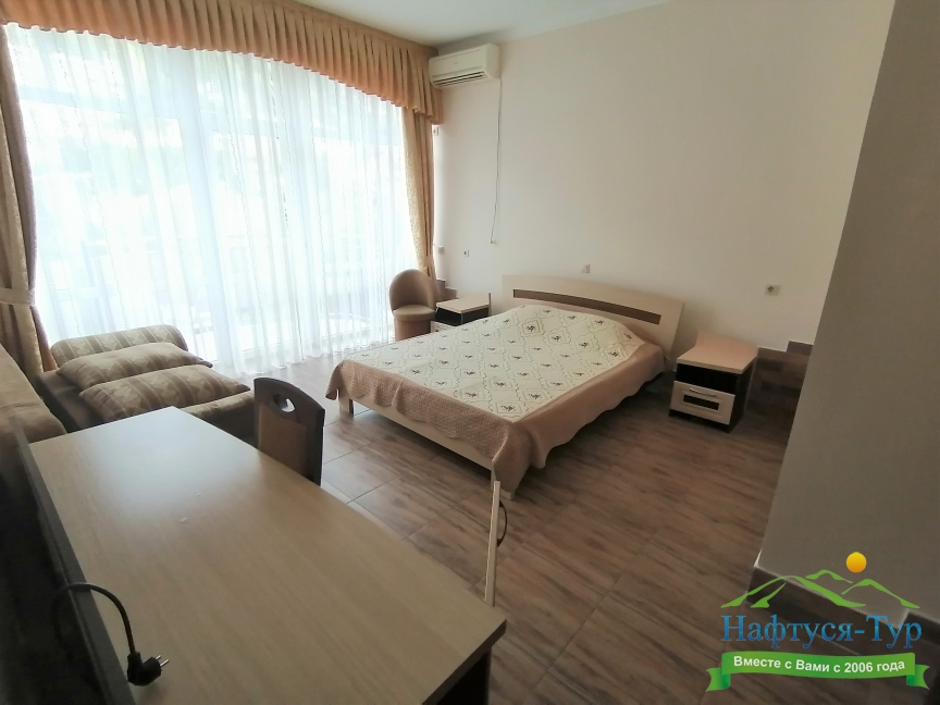 Небольшой, но очень уютный отель. Провели здесь прекрасную неделю. Обстановка тихая и спокойная. В номере чисто, хороший вид из окна, удобная двухместная кровать, телевизор, холодильник, кондиционер и комфортный диванчик.