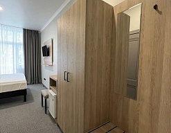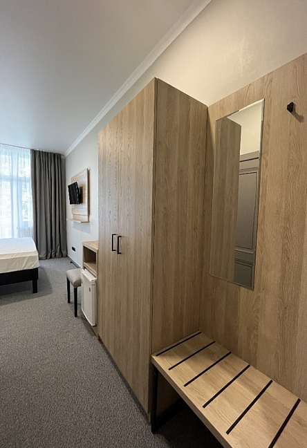 вешалка, зеркало, кровати односпальные /одна двуспальная кровать, прикроватные тумбочки, стол, стулья, шкаф