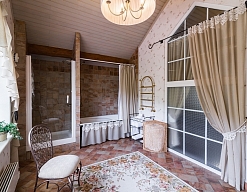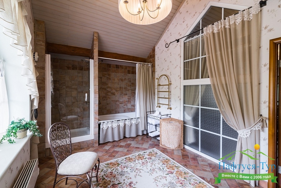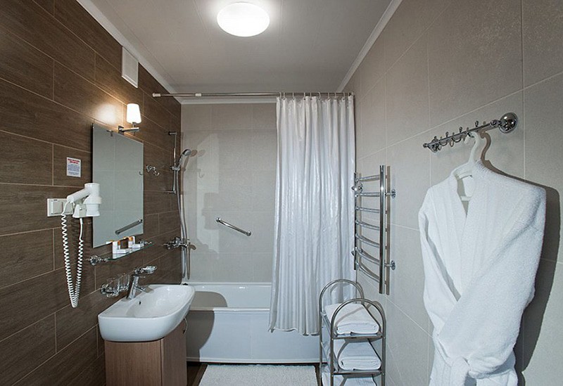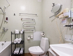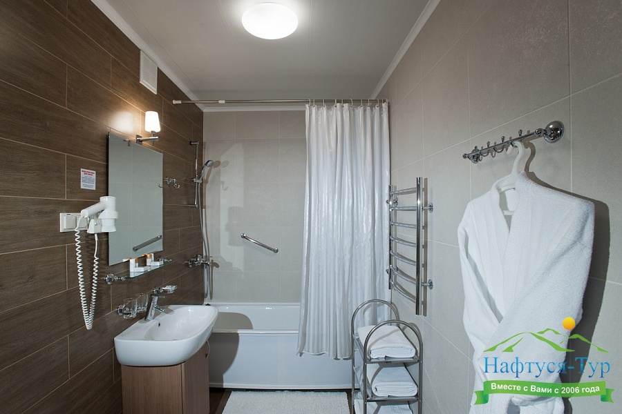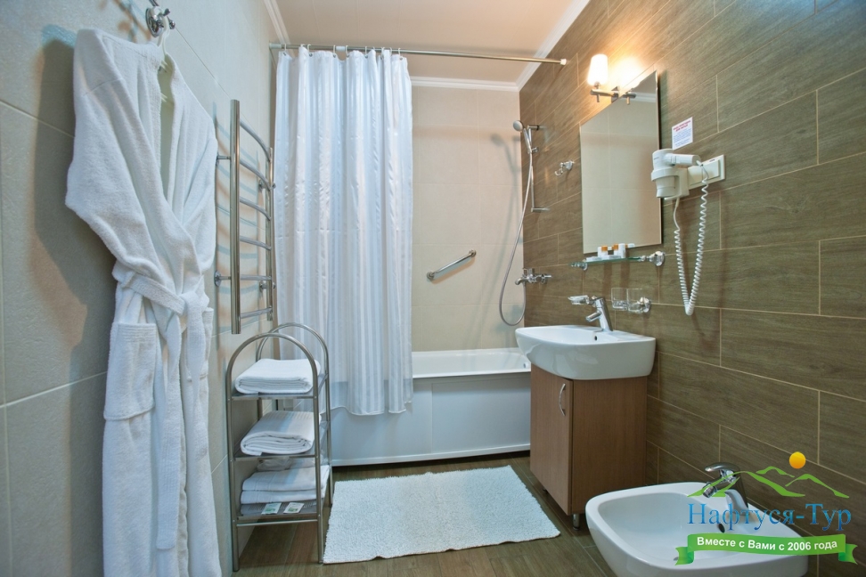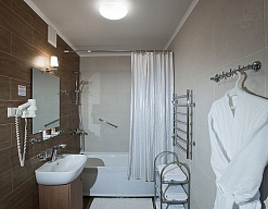 с ванной, тапочки, туалетные принадлежности, фен, халат