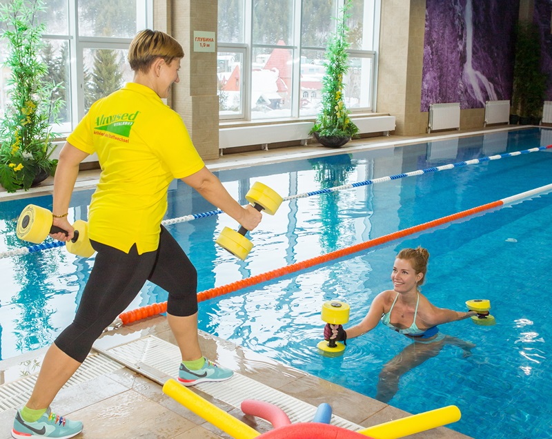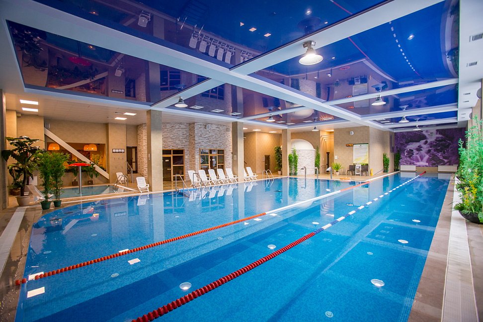 Бассейн с 27-метровыми дорожками, с чистейшей водой и температурой 28 градусов, оборудован: каскадным душем, гидро-и аэромассажными зонами, термальной зоной, фитобаром, а также местом для занятий аква-аэробикой.