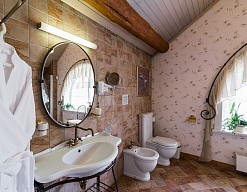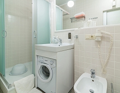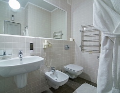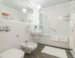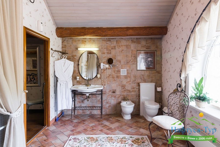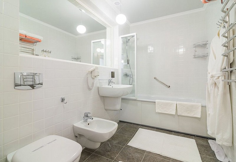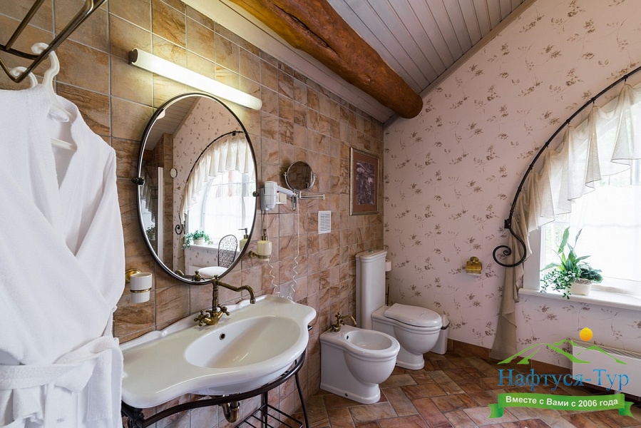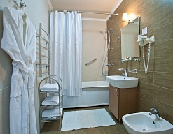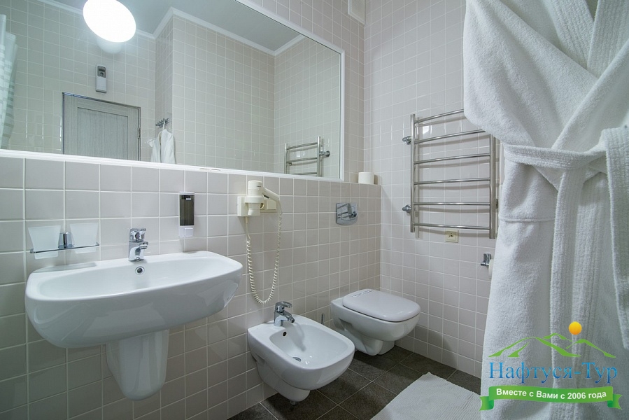биде, с ванной, тапочки, туалетные принадлежности, фен, халат
