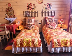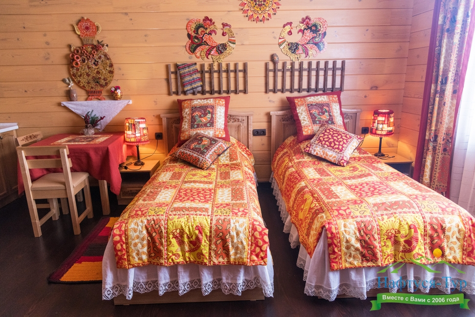 Оригинальное оформление, незабываемый интерьер, внутреннее убранство в стиле Сибирской Масленицы органично сочетаются с высоким уровнем комфорта и сервиса. Размещение происходит в комфортабельных номерах деревянных одноэтажных корпусов, общая вместимость которых составляет 28 мест.