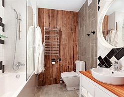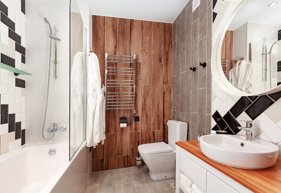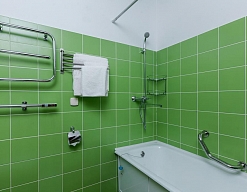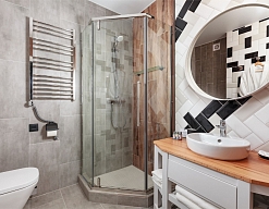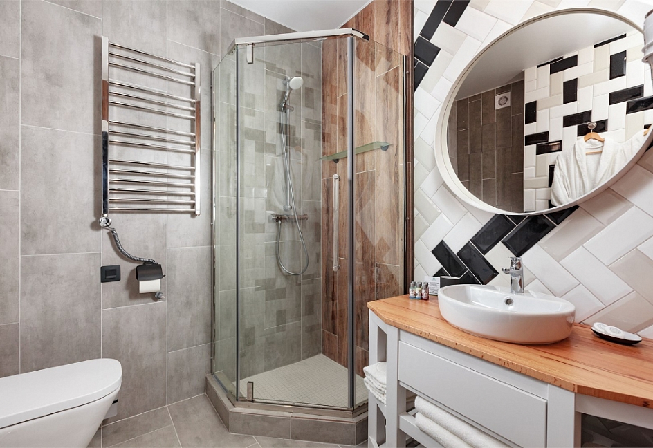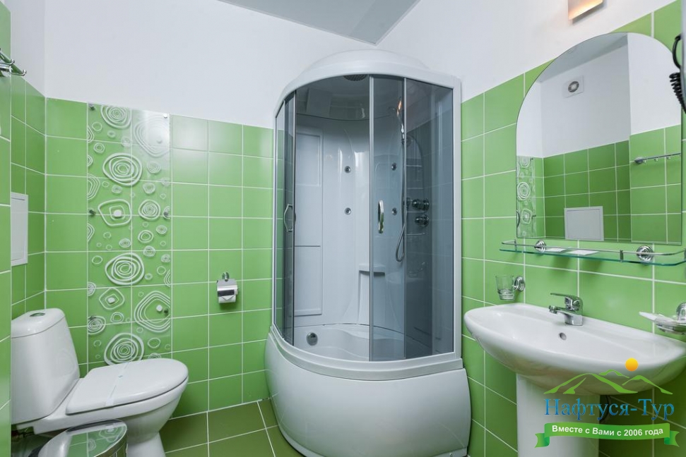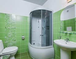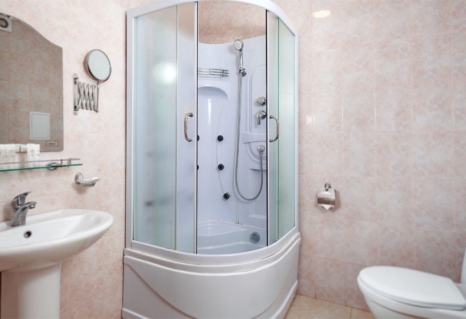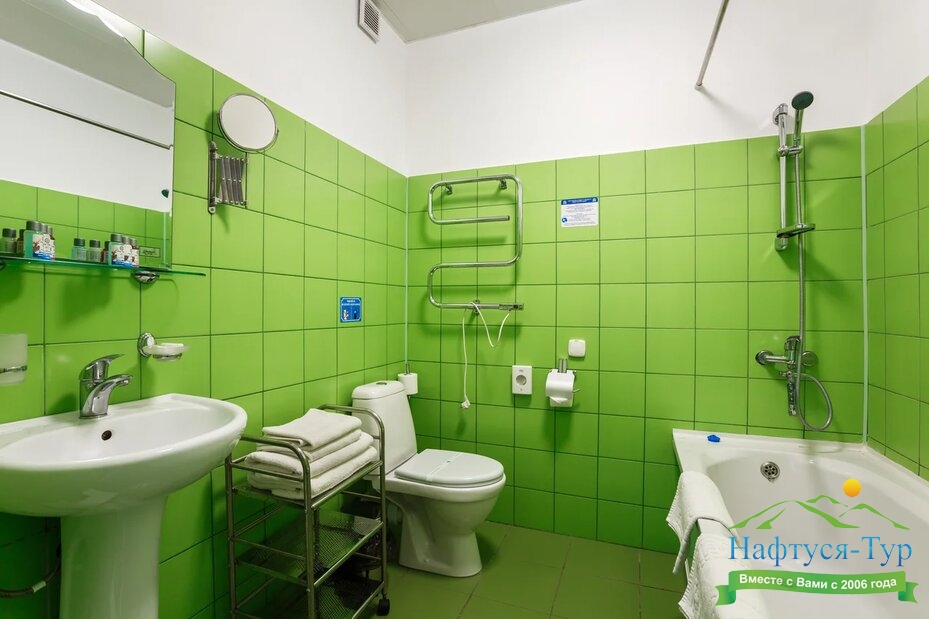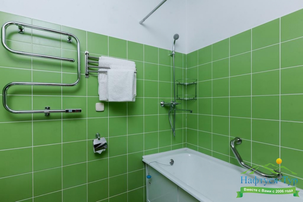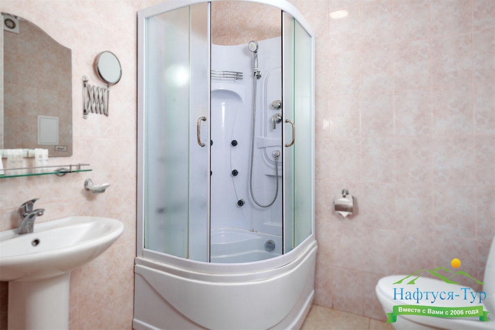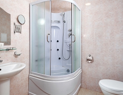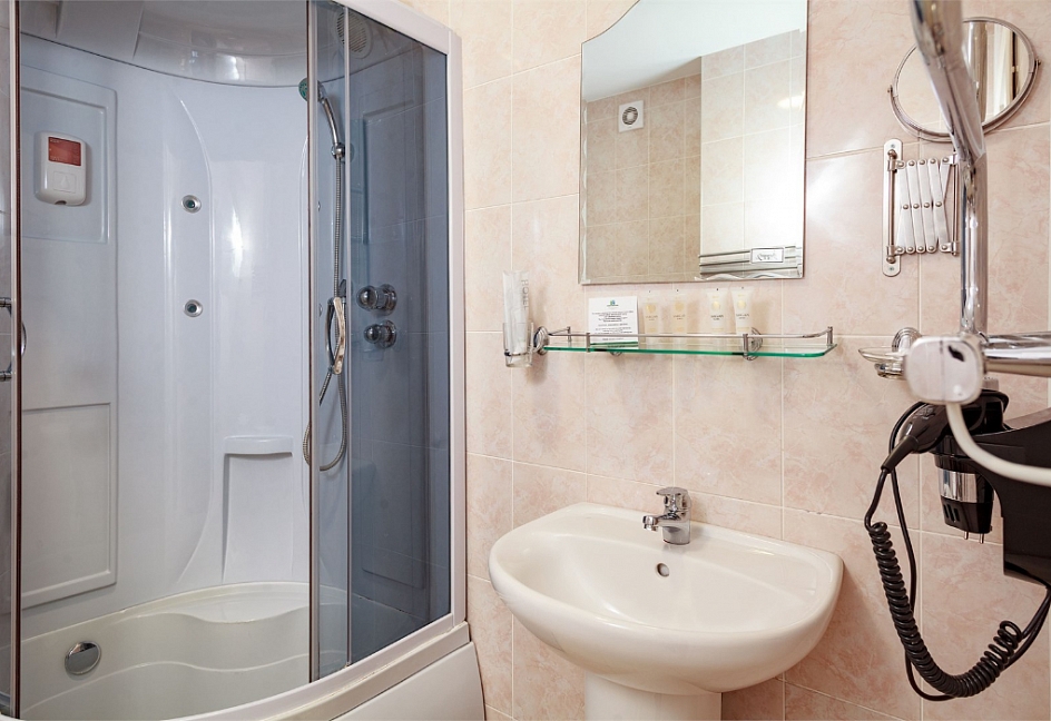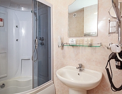 с душем или ванной, тапочки, туалетные принадлежности, фен, халат