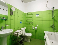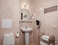 с ванной или душевой кабиной, тапочки, туалетные принадлежности, фен, халат