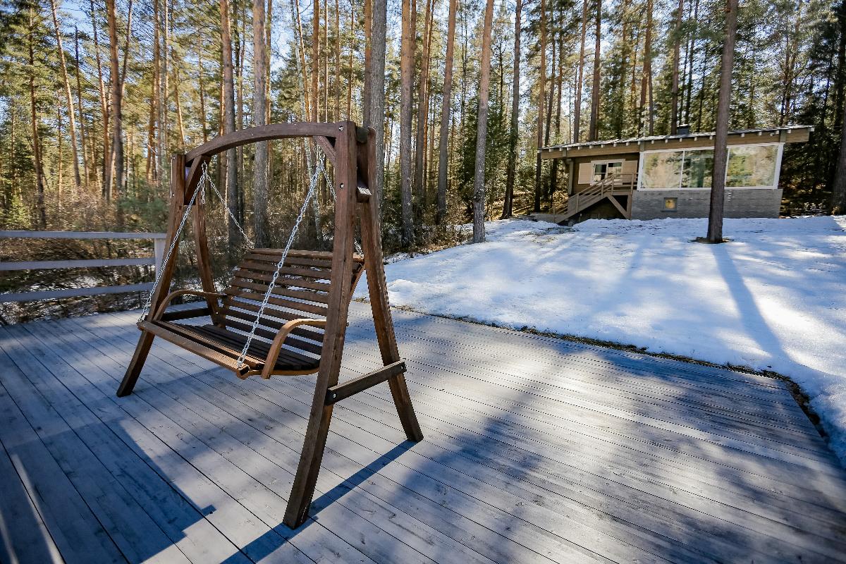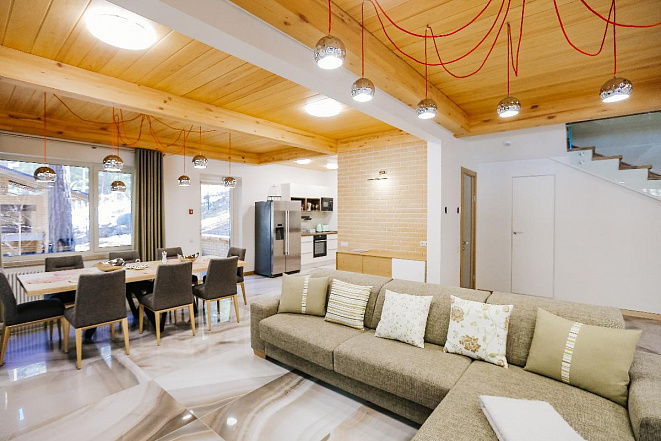 В доме удобно расположены две спальни с двуспальной и двумя односпальными кроватями, обеденной зоной и многофункциональной кухней.