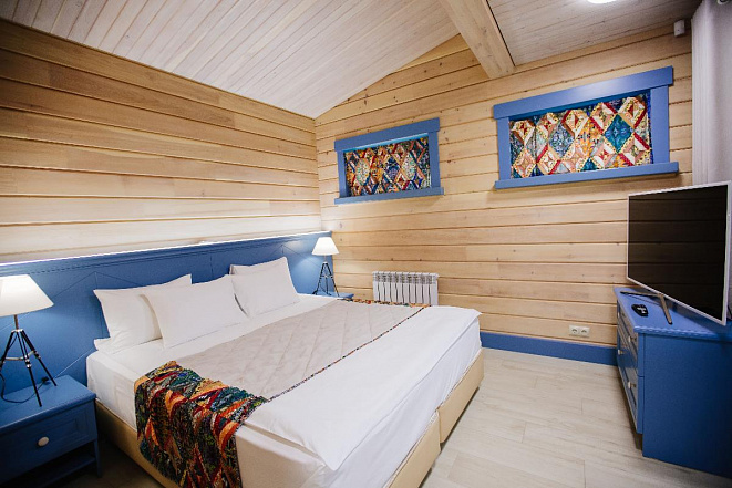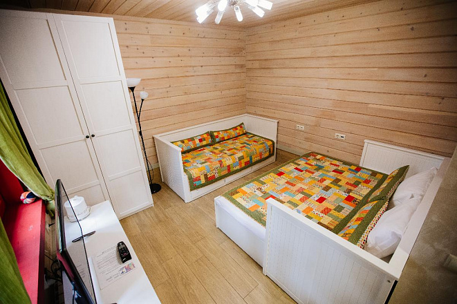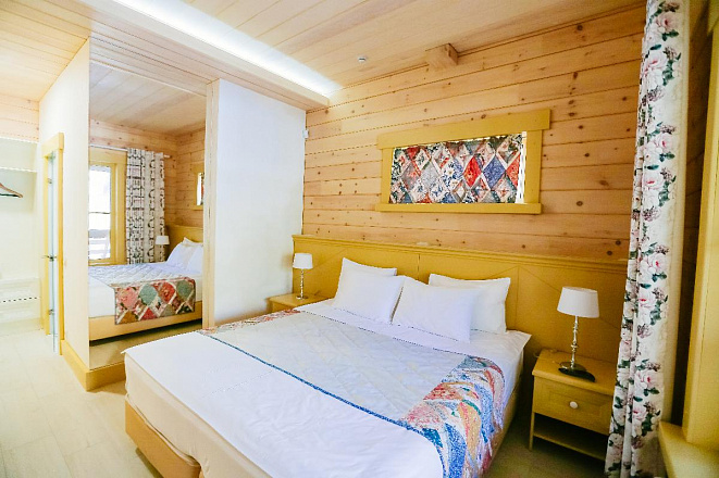 Отличный вариант для отдыха вдвоем. В номере одна двуспальная и одна односпальная кровать. Тёплый пол, ванная комната, мягкие халаты.