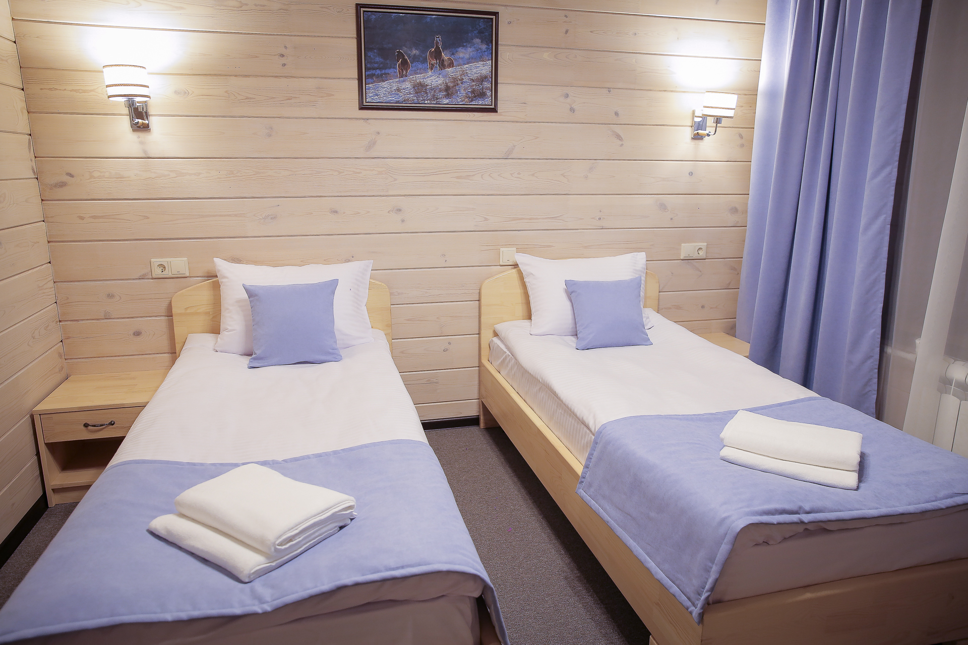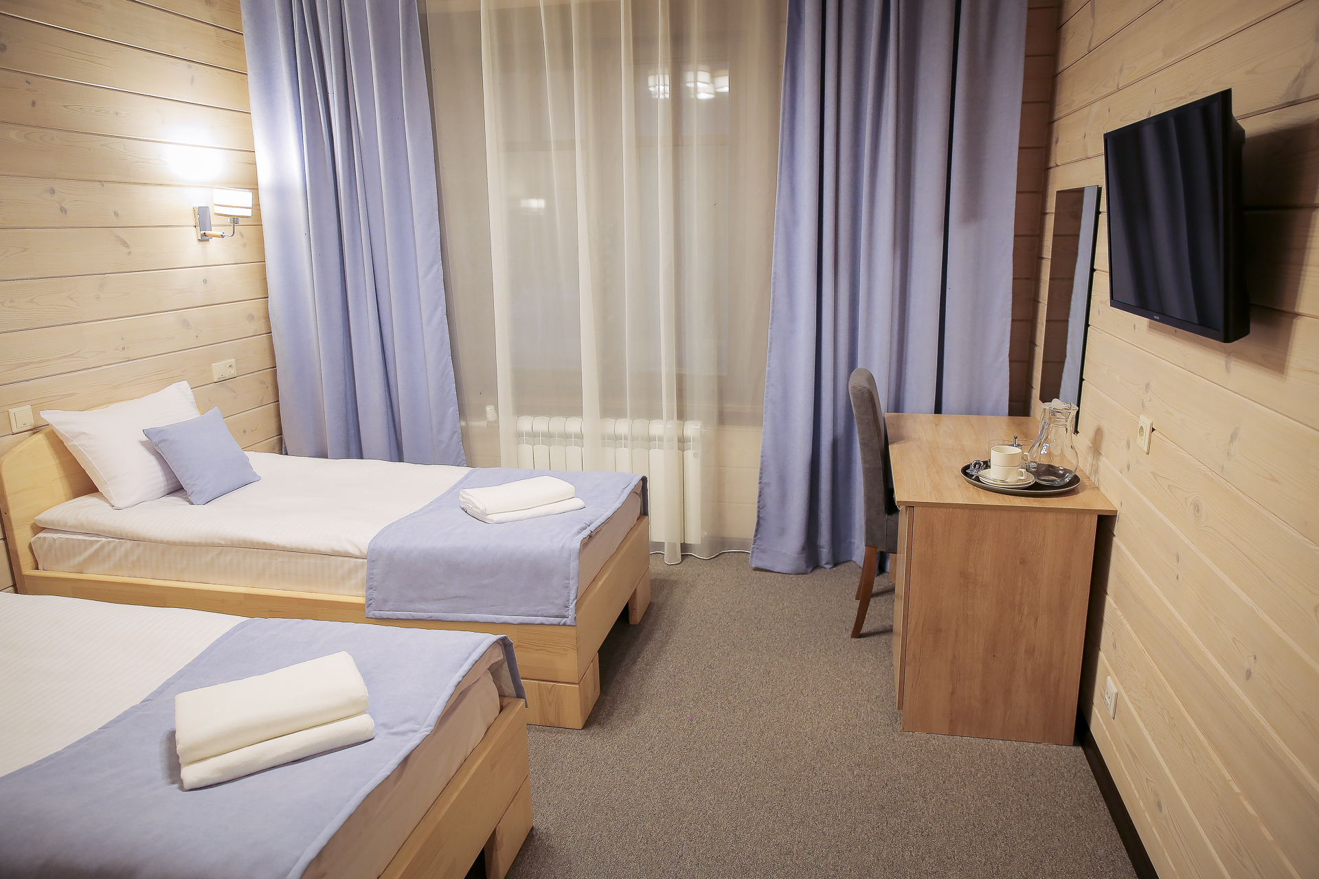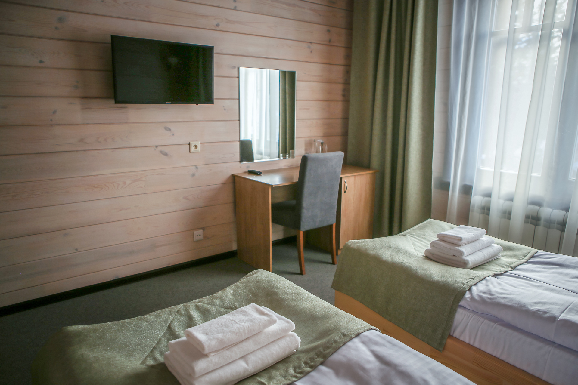 В обеих категориях номеров — современное ковровое покрытие, WI-Fi, мебель из натурального дерева, собственный санузел площадью 3,5 м.кв.