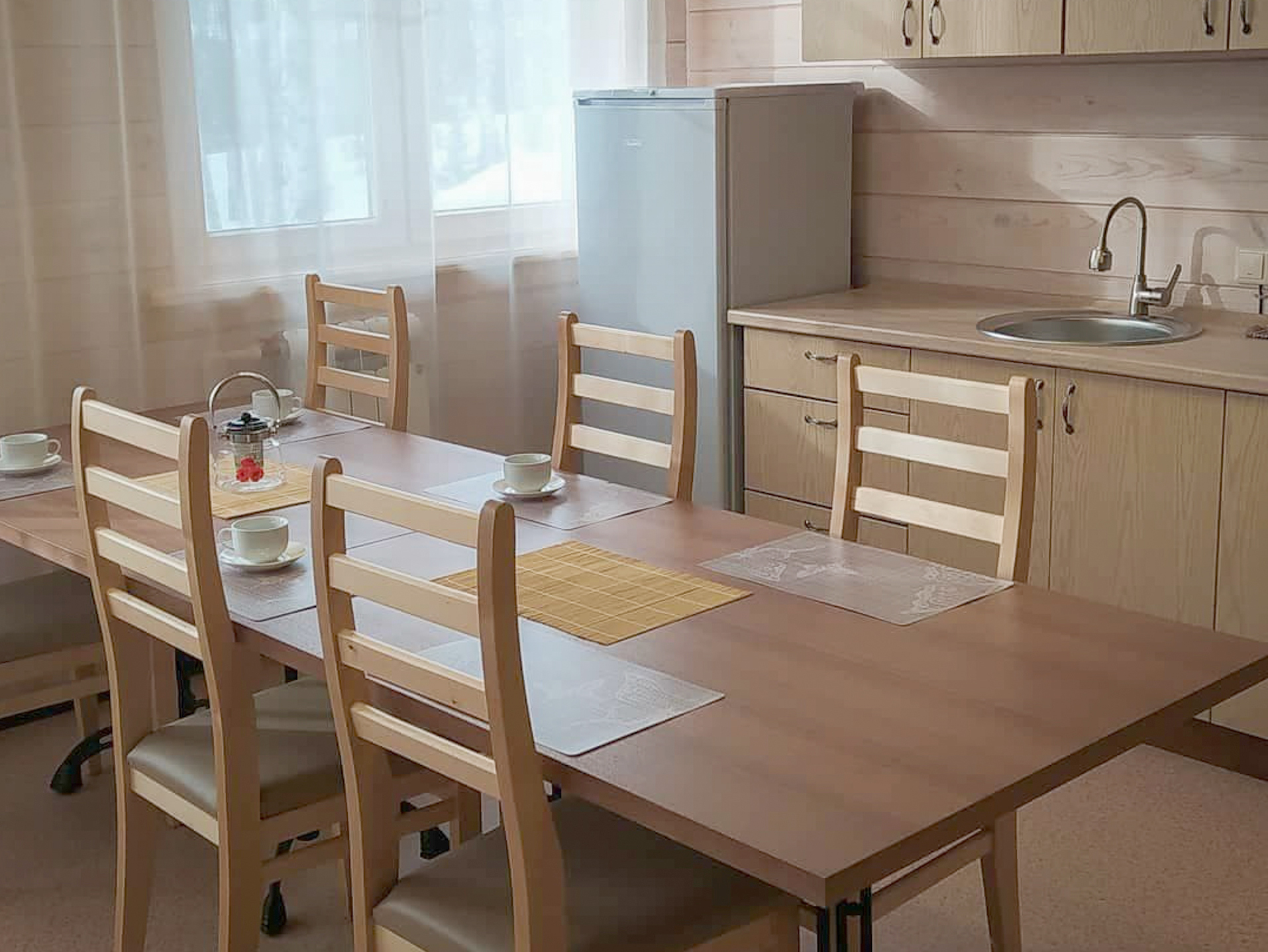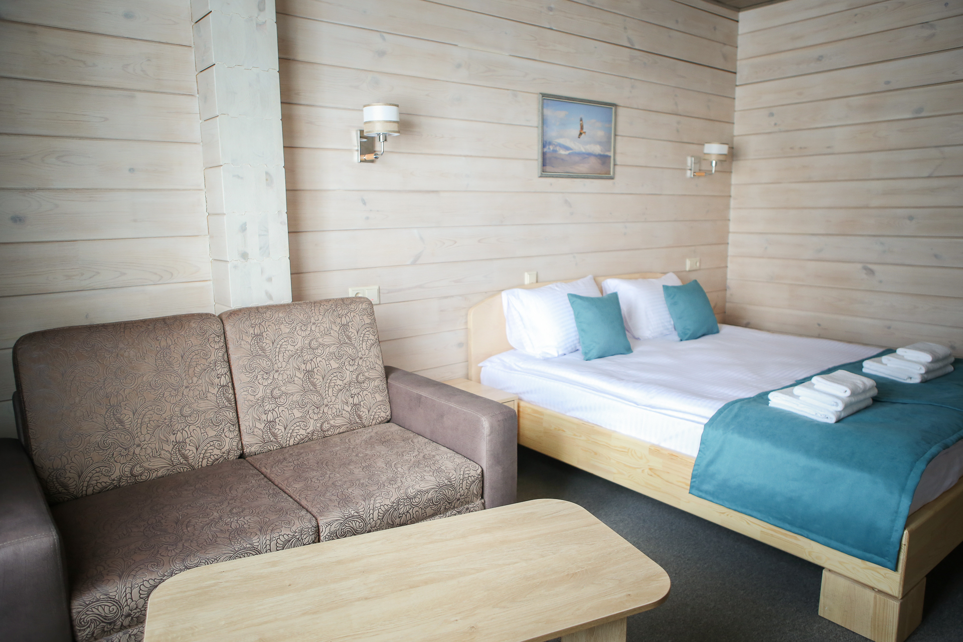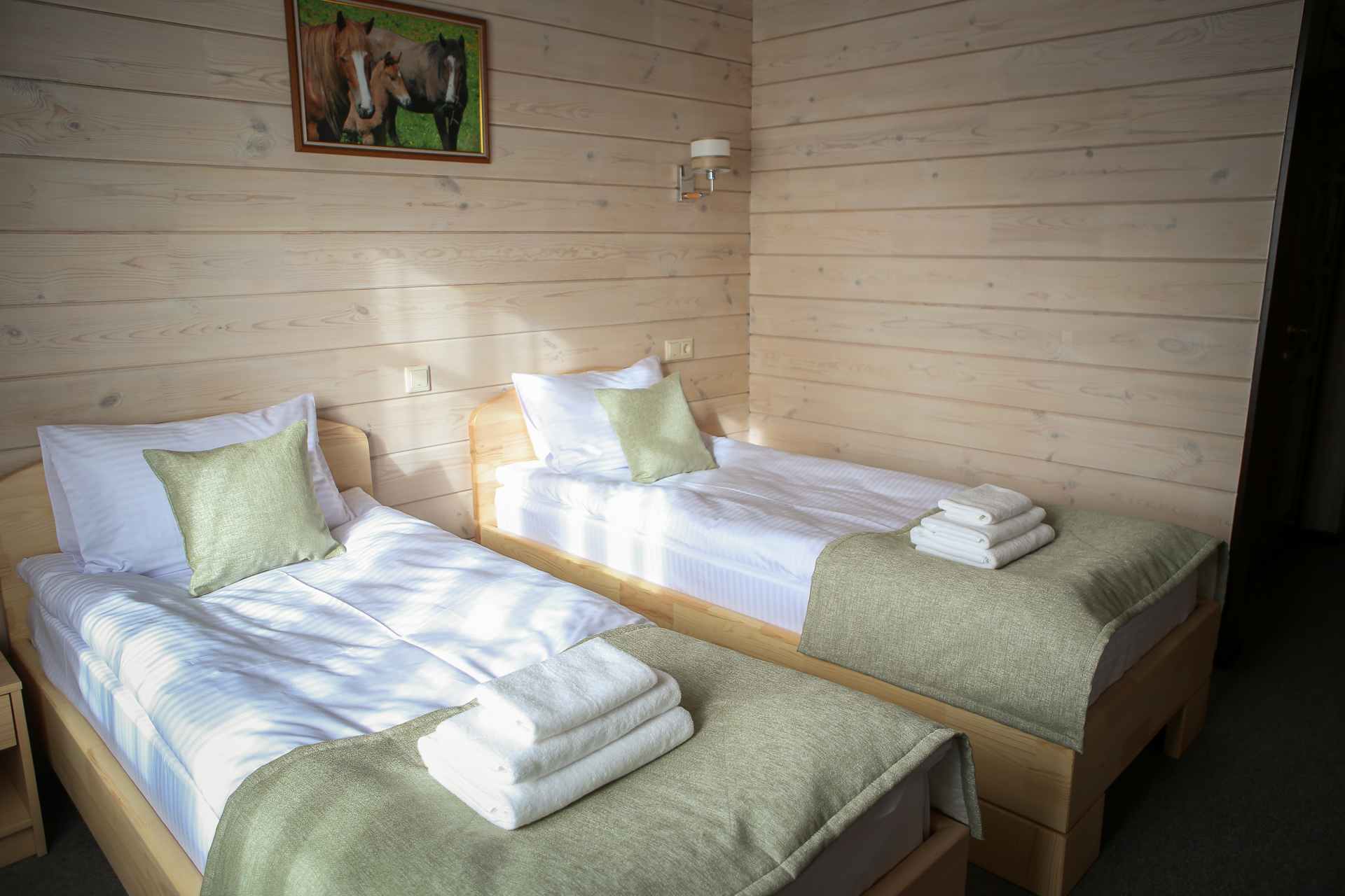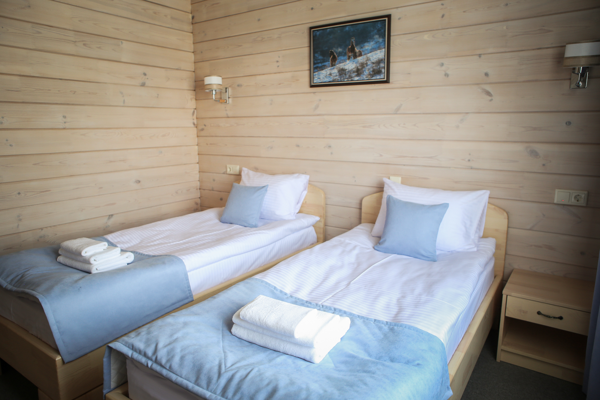 В обеих категориях номеров — современное ковровое покрытие, WI-Fi, мебель из натурального дерева, собственный санузел площадью 3,5 м.кв.