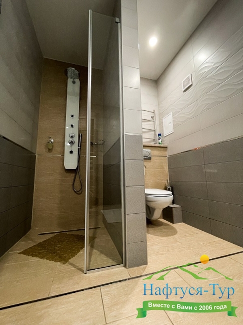 с душем, тапочки, туалетные принадлежности, фен, халат