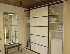 вешалка, зеркало, кровати односпальные /одна двуспальная кровать, прикроватные тумбочки, стол, стулья, шкаф