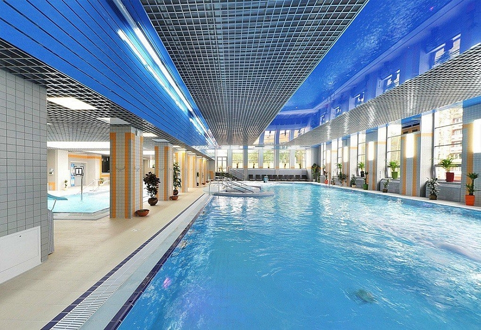 Комплекс включает: бассейн 22х11 (220 кв.м) оздоровительный с гидромассажными установками, глубина до 1,5 м, детский бассейн с горкой , гидромассажный бассейн, русскую парную, финскую сауну, турецкий хамам, комнату льда, купель, минибар.