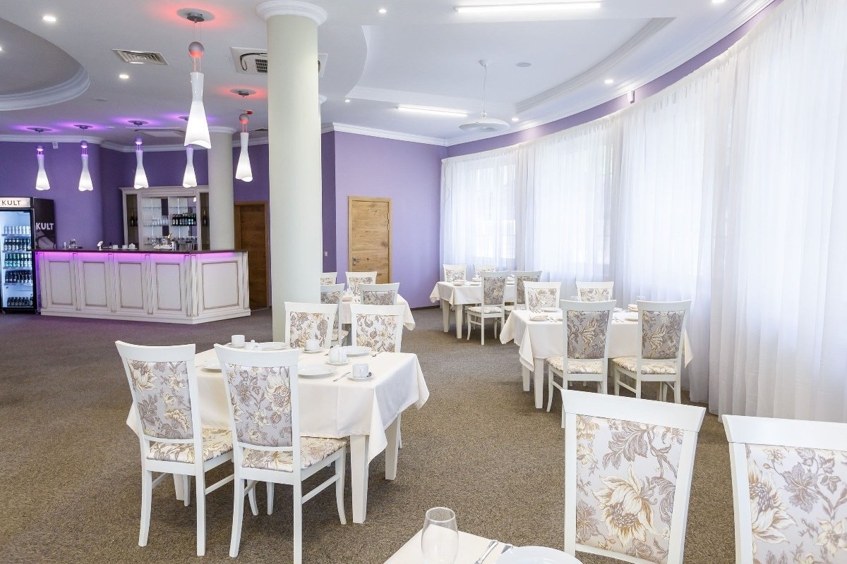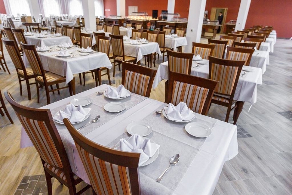 Ресторан "Плисса" соединен теплой переходной галереей с жилым корпусом и располагается на 2-м этаже санатория. Питание организовано по принципу самообслуживания. В зале свободная посадка за столами.