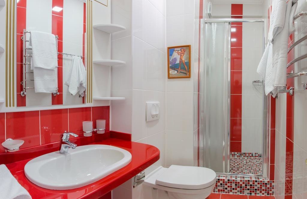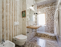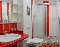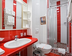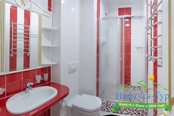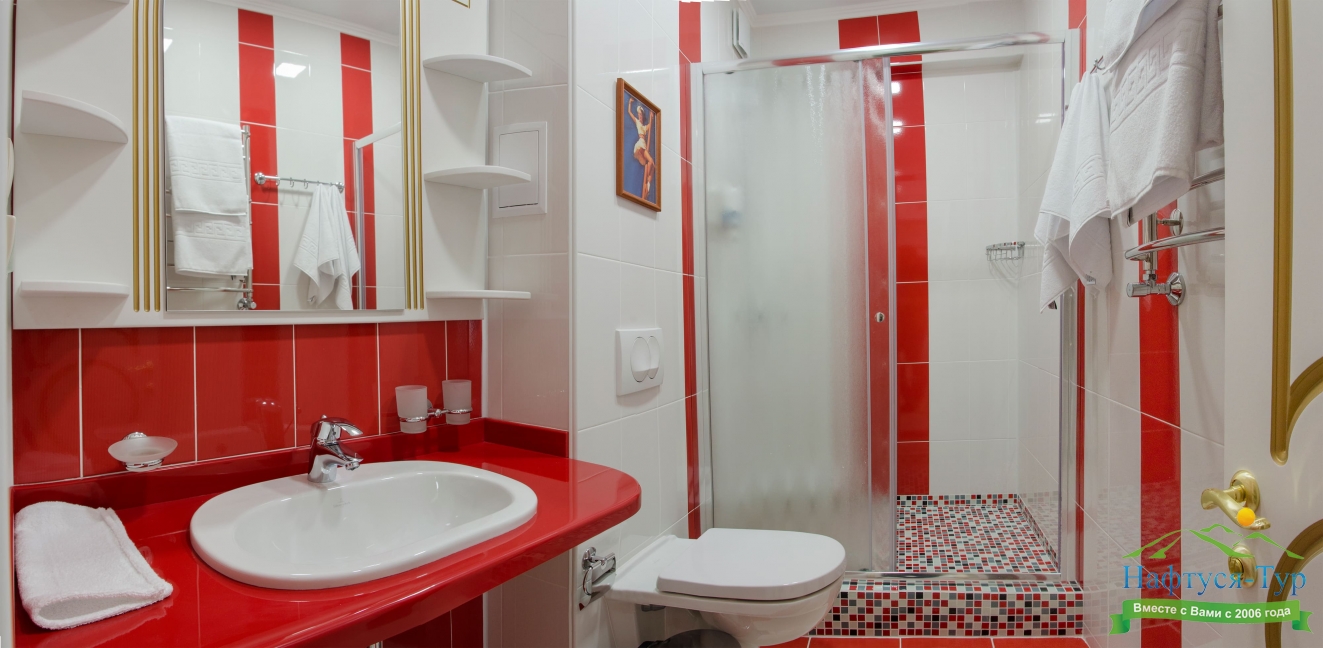 с душевой кабиной, тапочки, туалетные принадлежности, фен