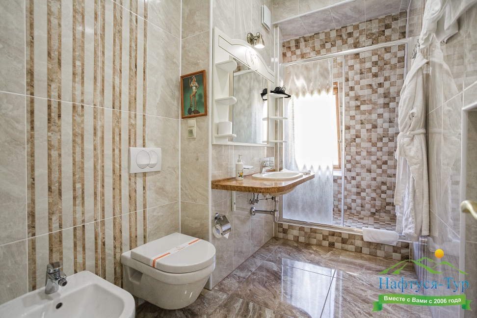 с душевой кабиной, тапочки, туалетные принадлежности, фен, халат