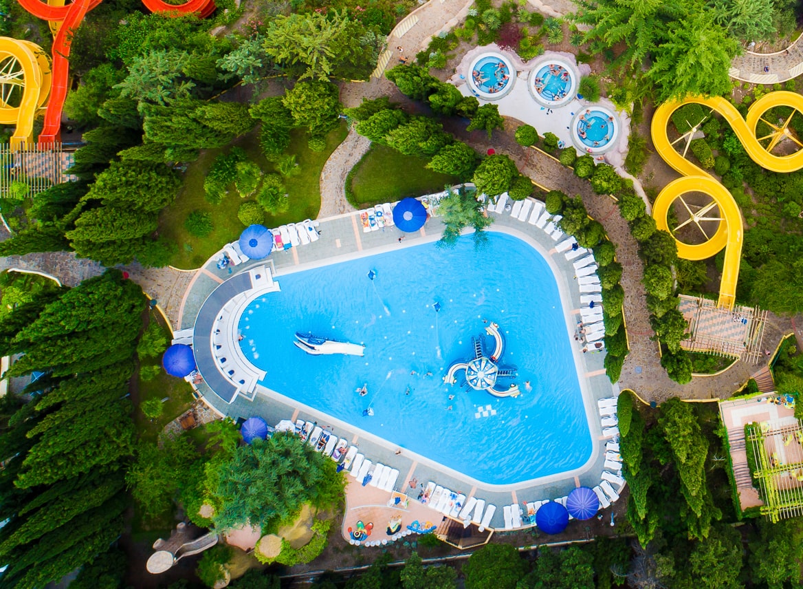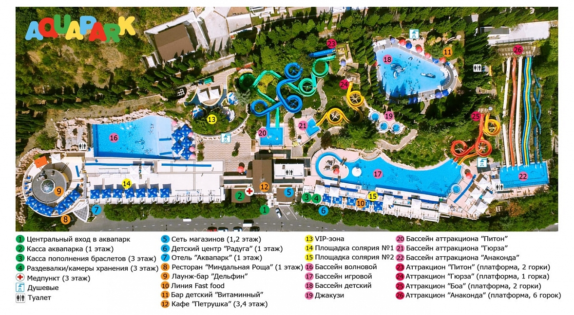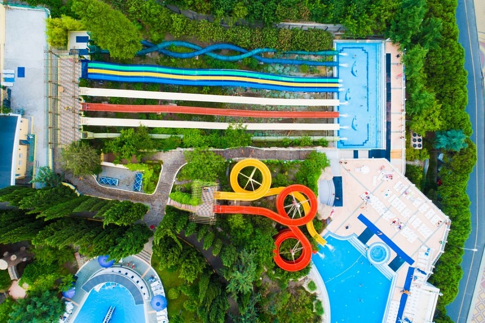 • АКВАПАРК: 6 бассейнов, 4 платформы для спуска с горок, 14 водных горок – все это есть в аквапарке