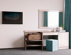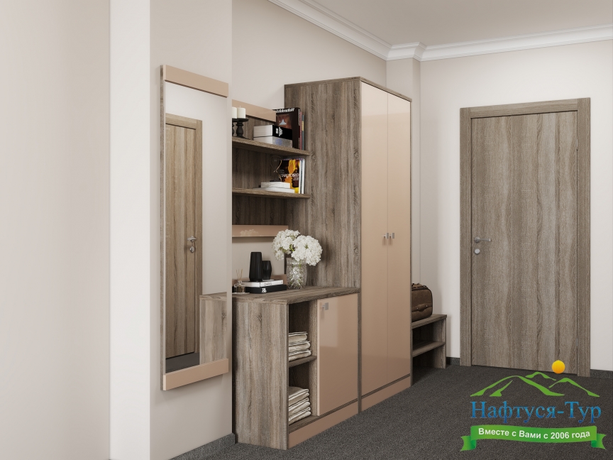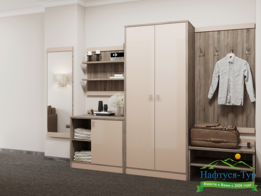вешалка, зеркало, кровати односпальные /одна двуспальная кровать, прикроватные тумбочки, стол, стул, шкаф