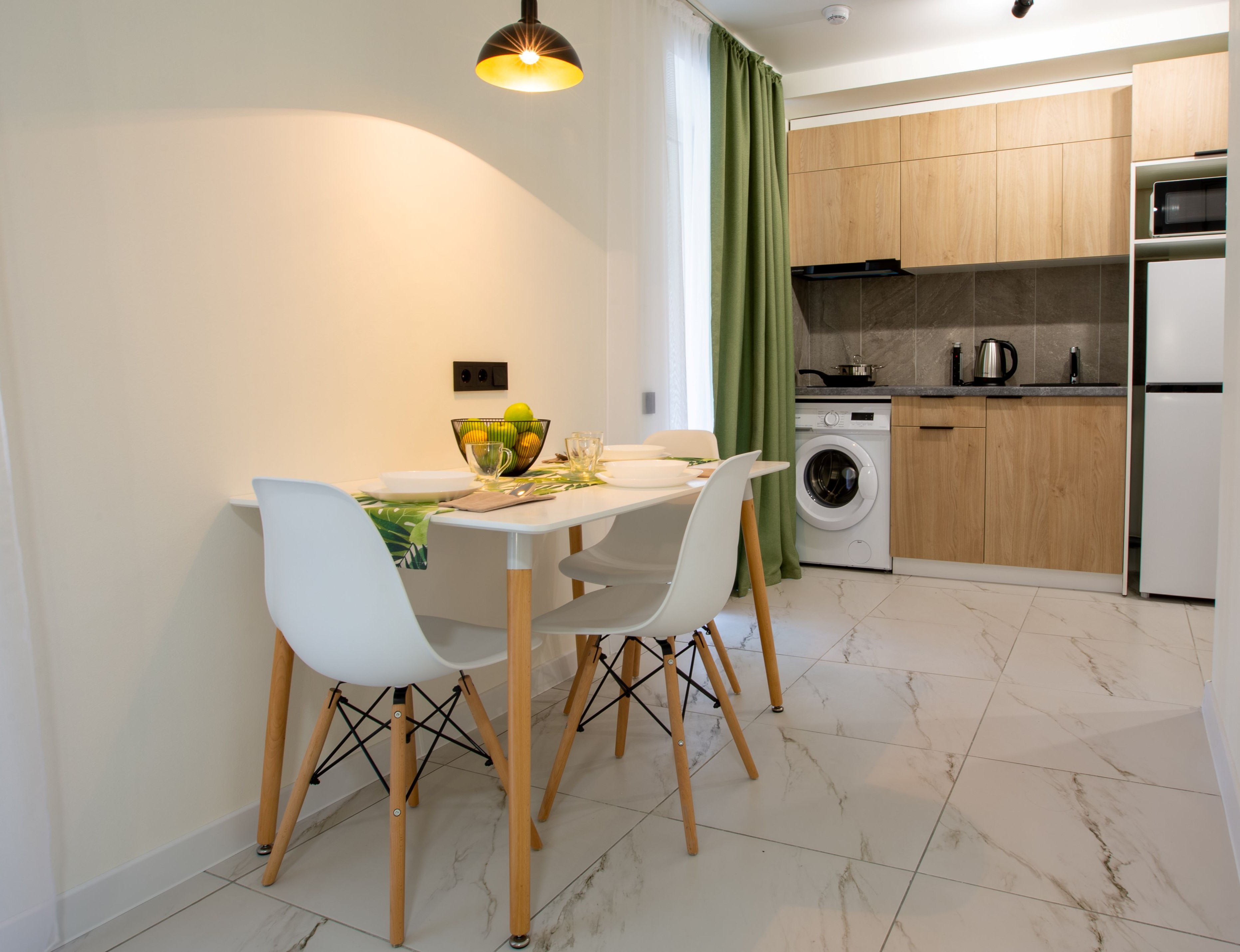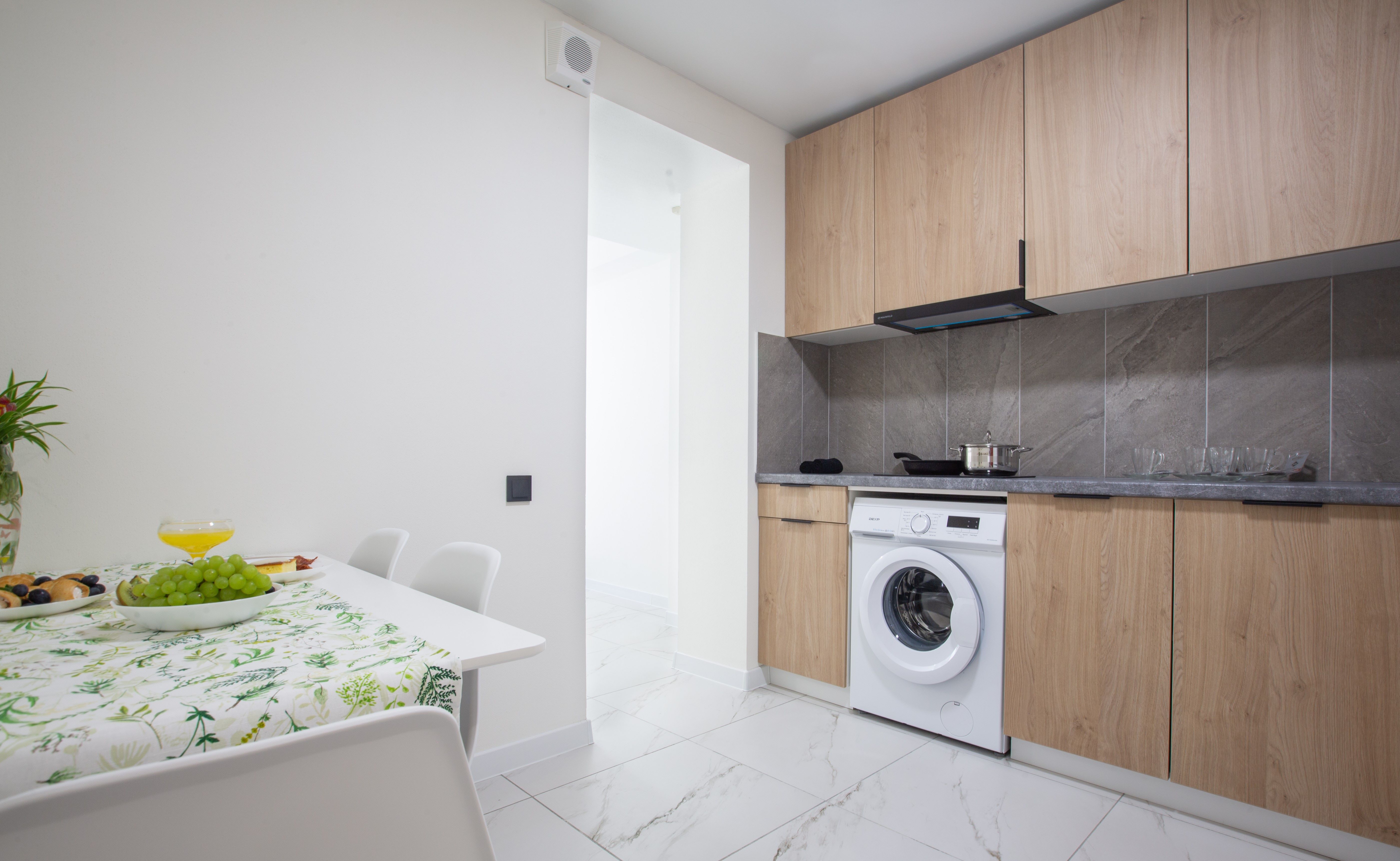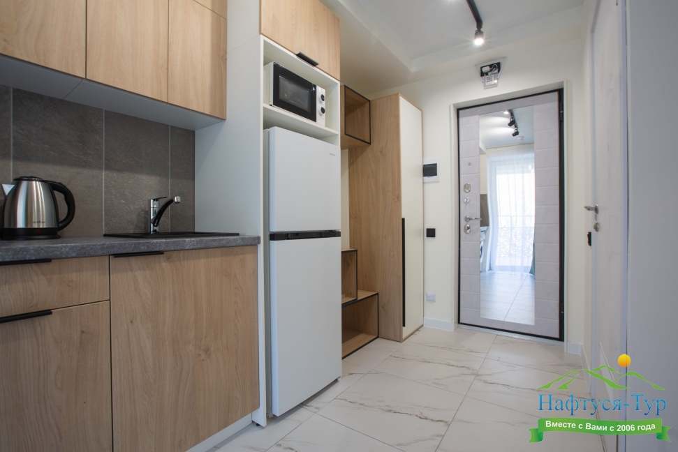 вешалка, зеркало, кровати односпальные, кухонная мебель, прикроватные тумбочки, стол, стулья, шкаф