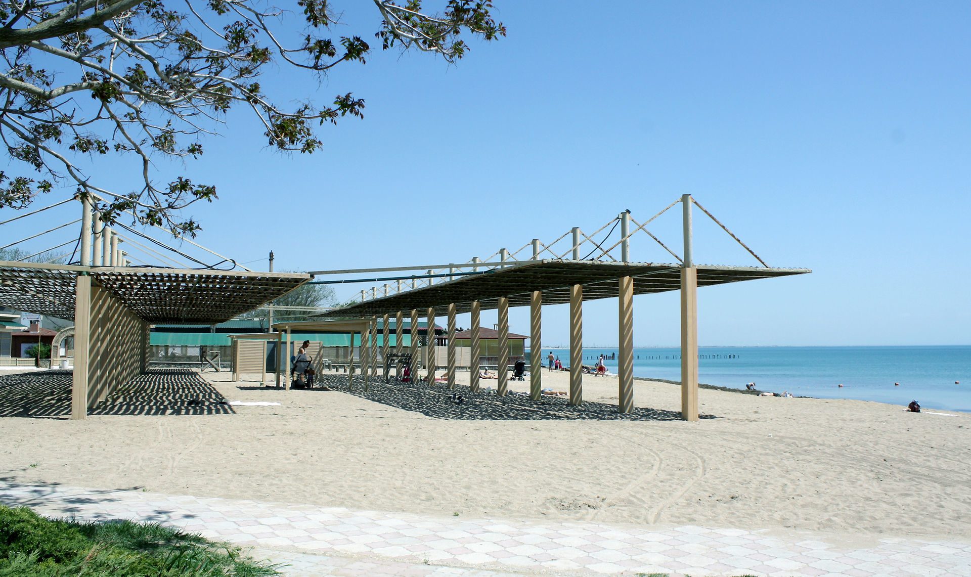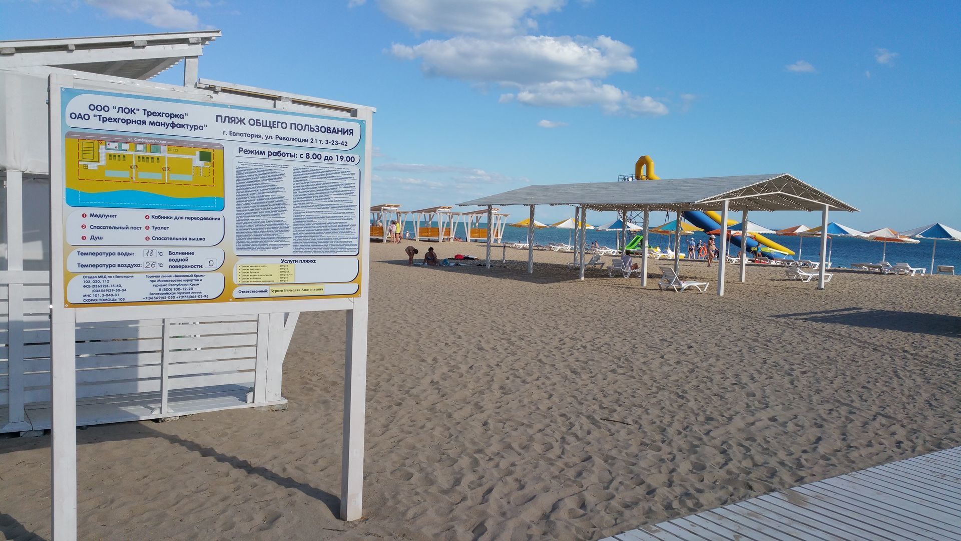 Расположение: Первая линия у моря (100 м до пляжа), 2 км до центра Евпатории, 60 км до аэропорта Симферополь