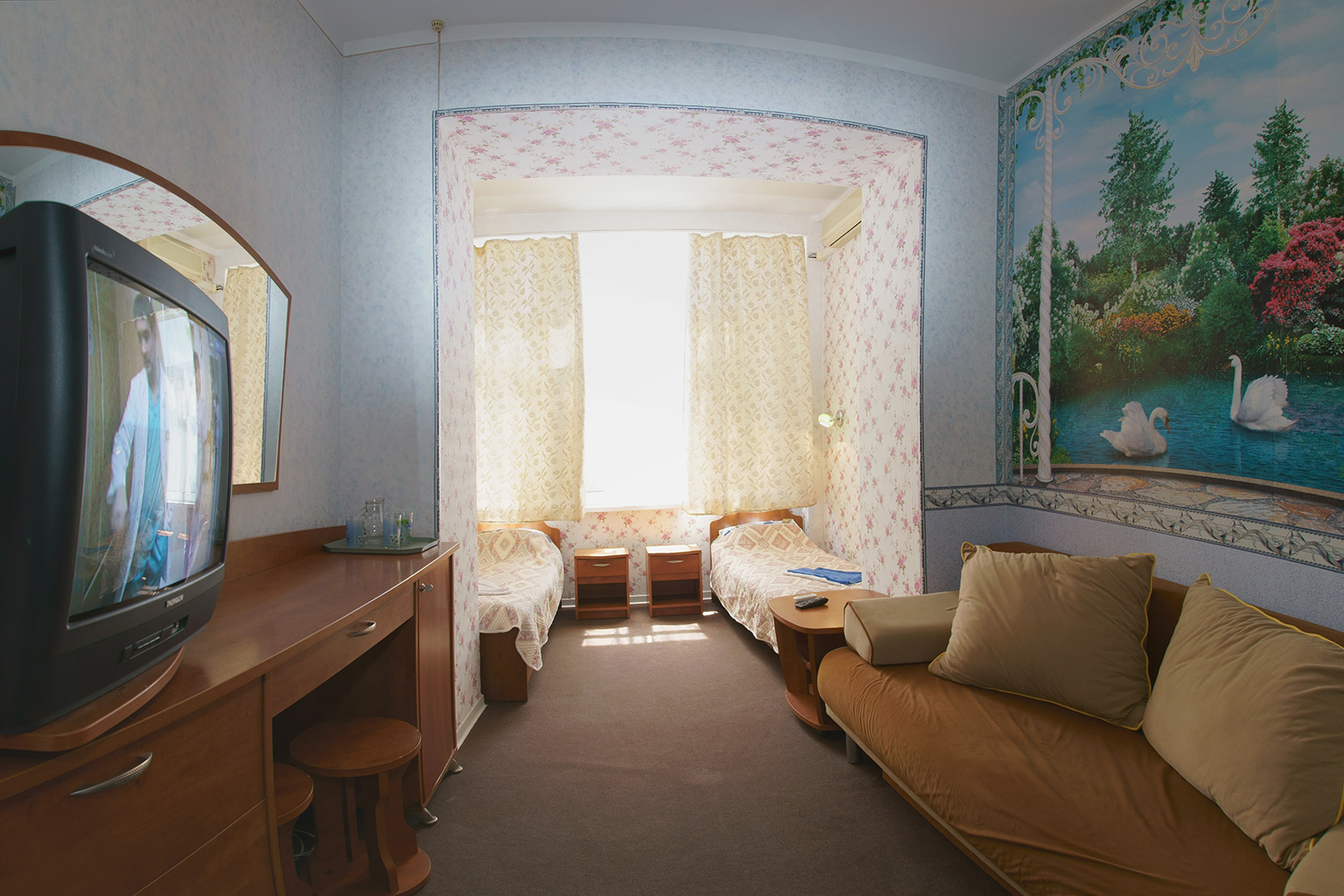 Трехэтажный корпус отеля расположился на парковой территории площадью 10 гектаров. Гостей ожидают двухместные номера Стандарт с собственной ванной комнатой. Во всех номерах имеются односпальные кровати, телевизор и мини-холодильник, некоторые комнаты оснащены сплит-системой.