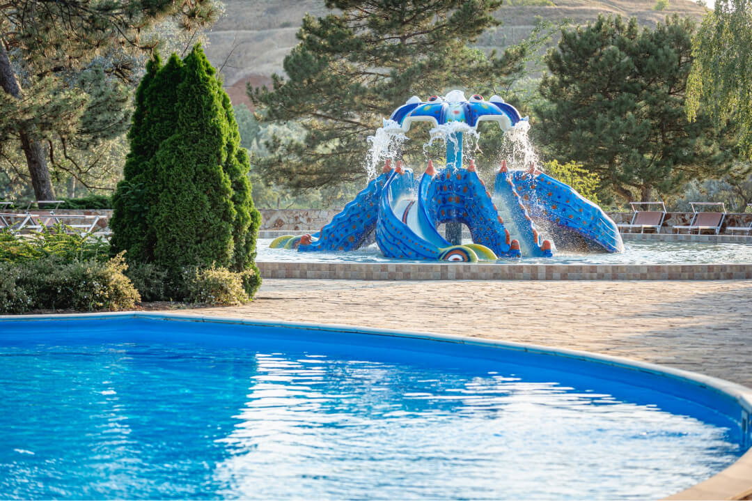 На территории курортного поселока находятся: ресторан, пешеходный музыкальный светодинамический фонтан, отель, СПА-комплекс, уникальная соляная пещера, открытый и крытый бассейны с подогревом, парковка.