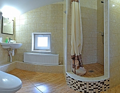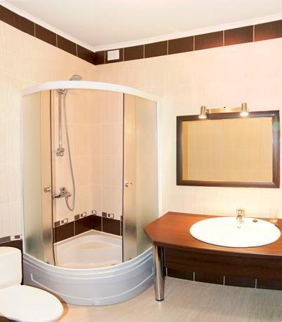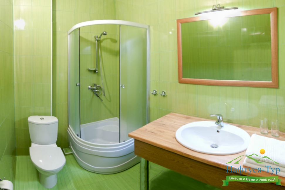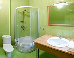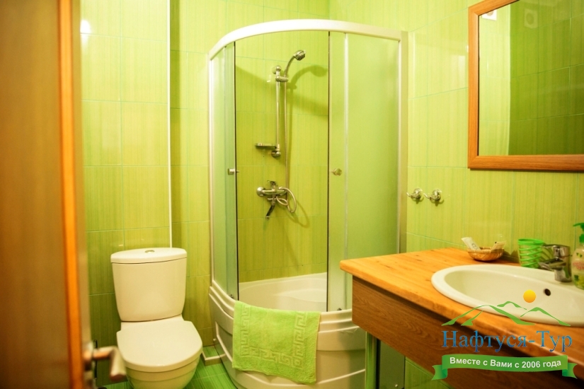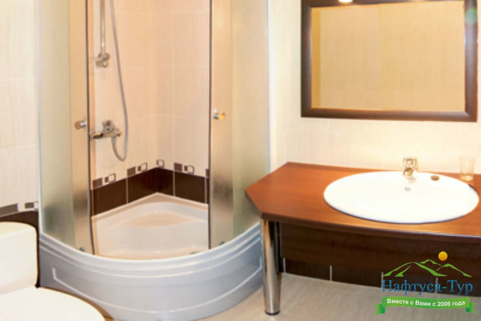 с душевой кабиной, туалетные принадлежности, фен