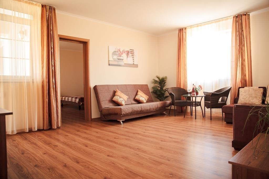 - междугородним автобусом до г. Симферополь, далее переехать на автостанцию «Курортная», далее маршрутным такси до автовокзала г. Саки, далее маршрутным такси до п. Новофедоровка, далее пешком до отеля 500 м.