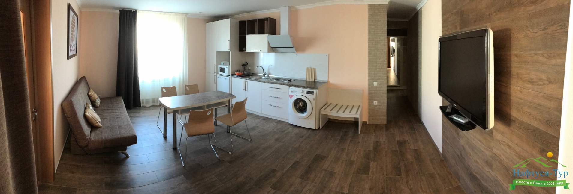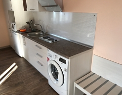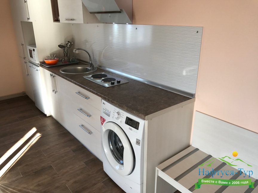 кондиционер, микроволновая печь, набор посуды, стиральная машина, телевизор, холодильник, электрическая плита, электрочайник
