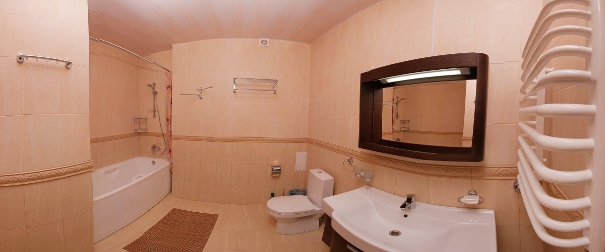 с ванной, тапочки, туалетные принадлежности, фен, халат