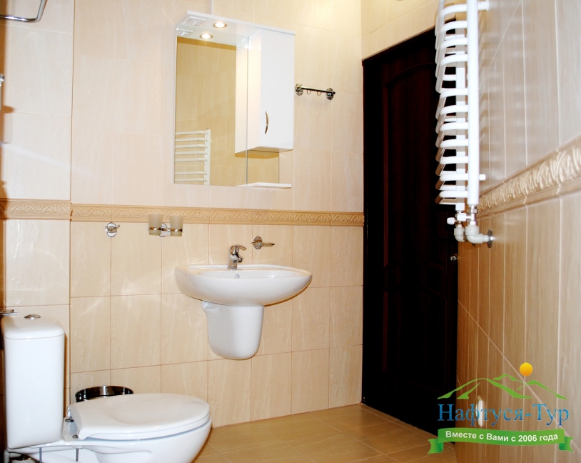 с душем, тапочки, туалетные принадлежности, фен, халат