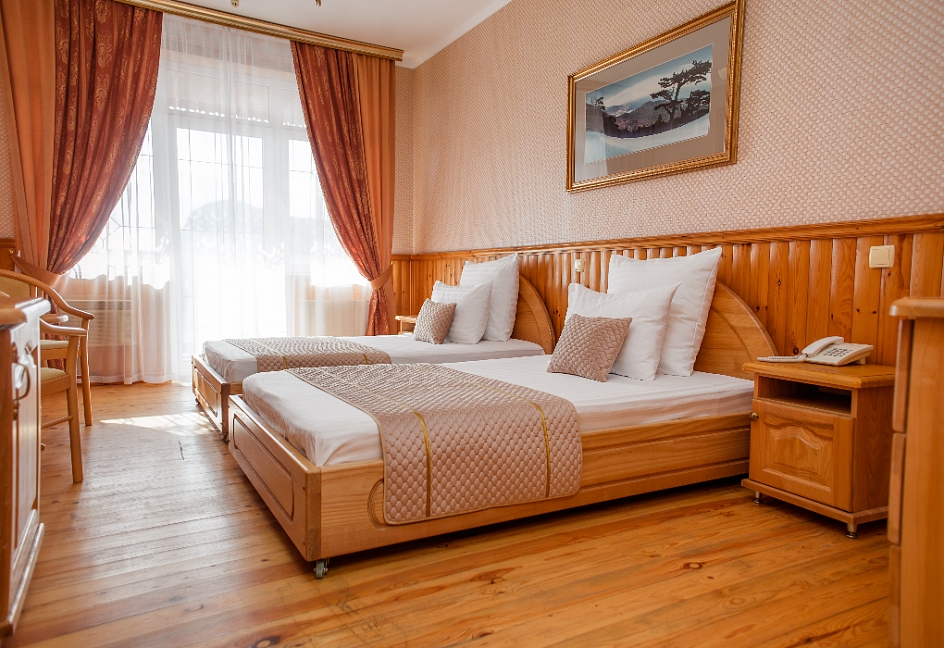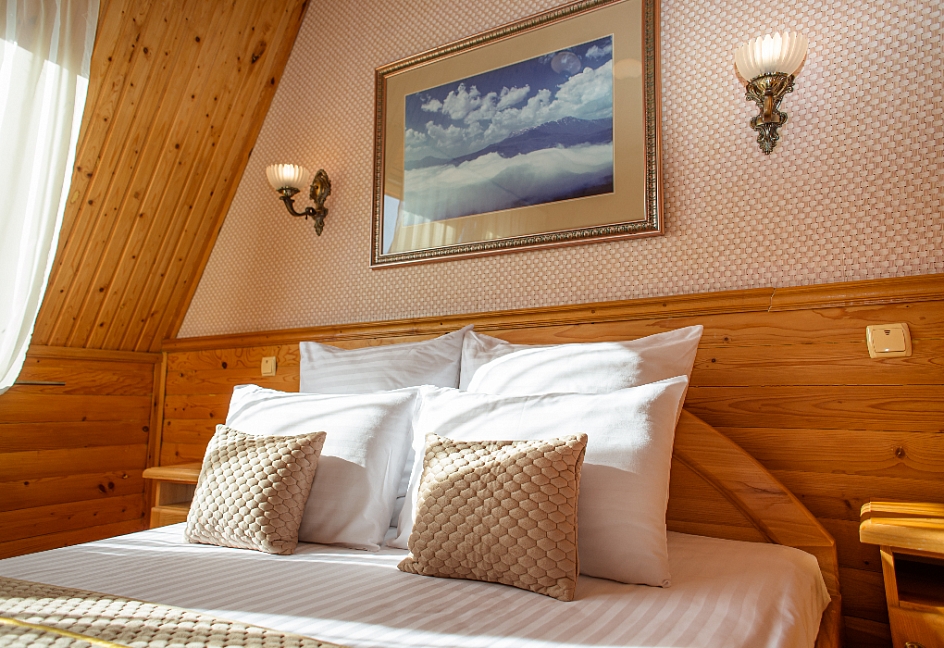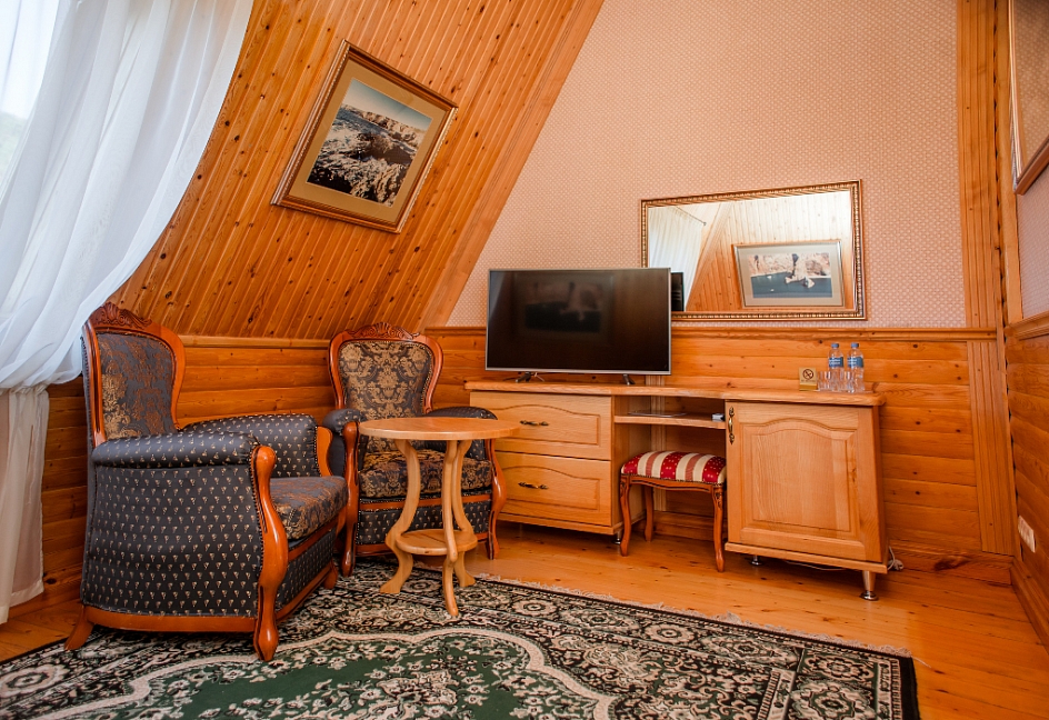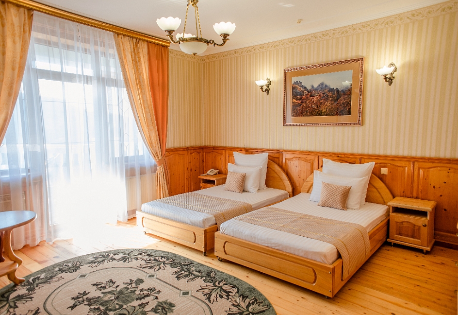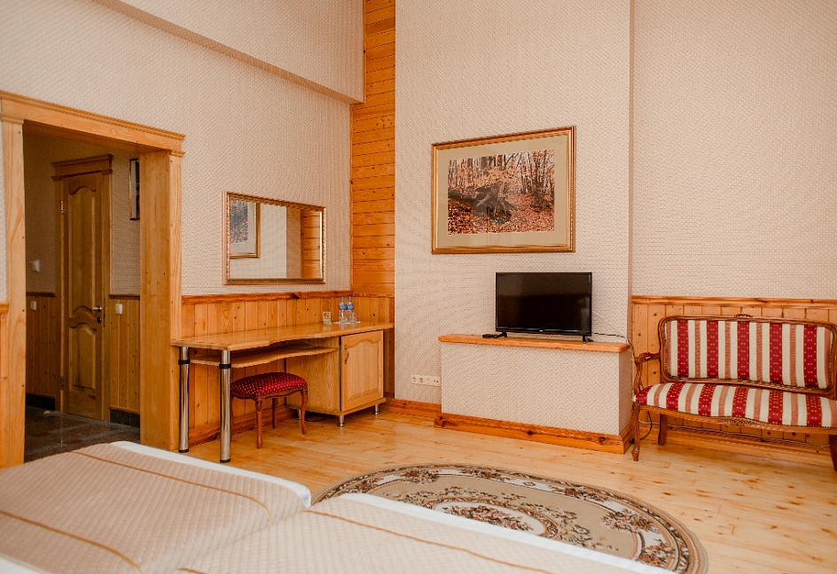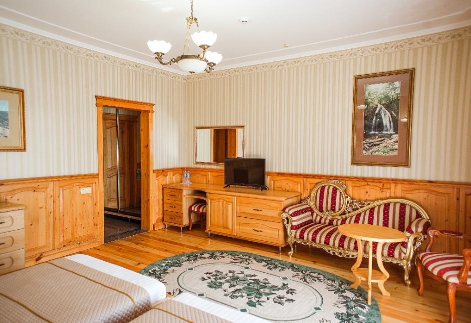 Очень красивый отель, отделка камнем и деревом (без пластика) в классическом стиле. Наш номер был выдержан в стиле отеля. Уборка хорошая. Обслуживание на высоком уровне. Отдельно хочу отметить ресторан.