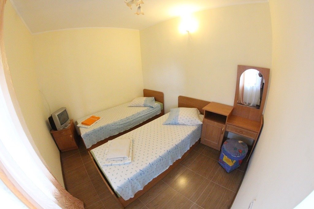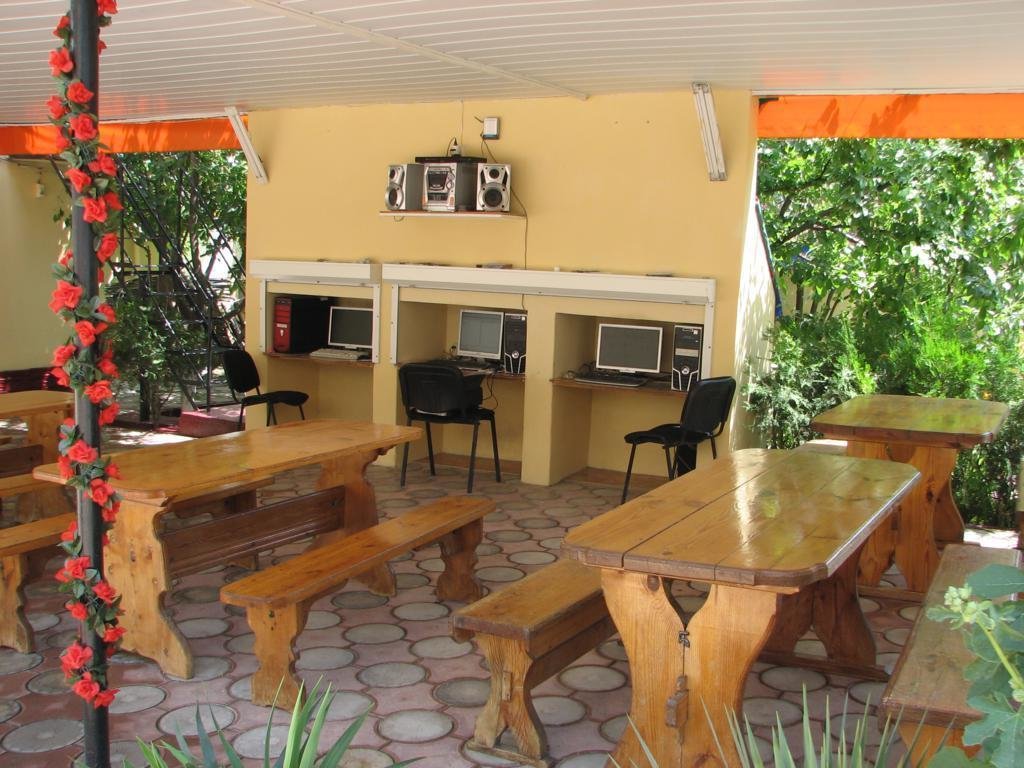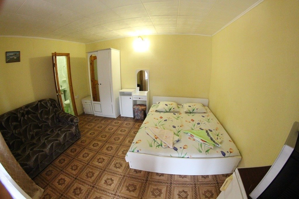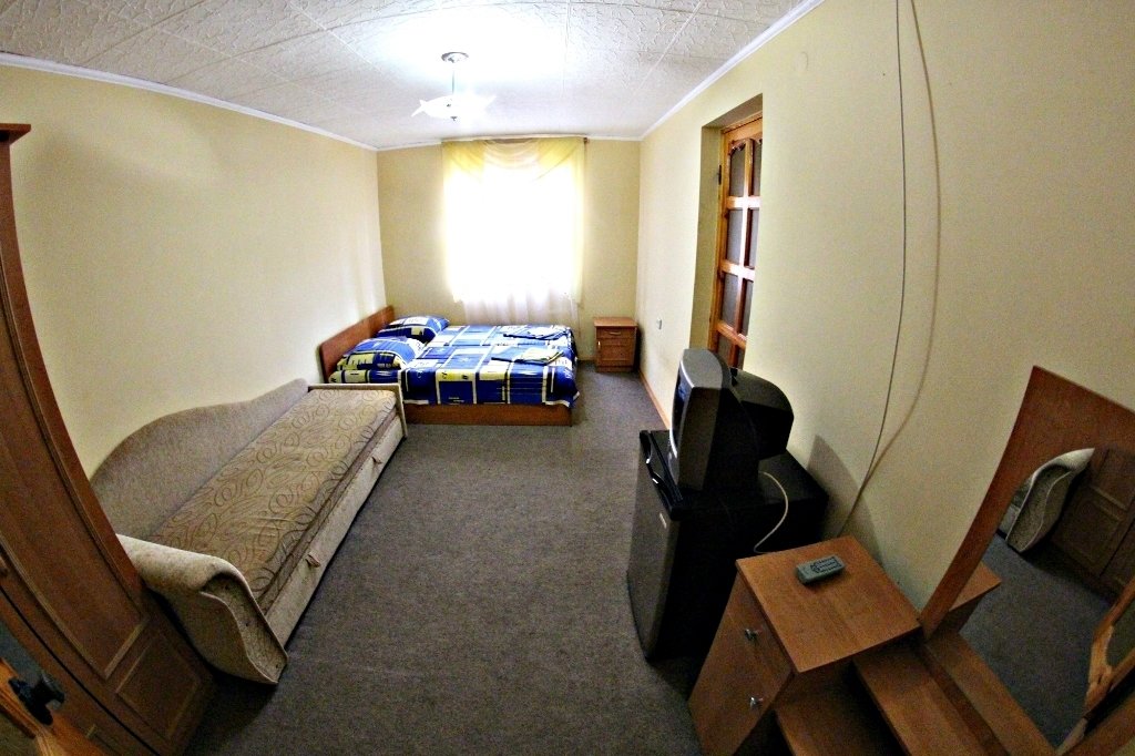 Все фото этого курятника-20 летней давности) По факту-застиранные простыни,подгнившее от старости белье,атмосфера запустения и брошенности.Видимо в советские времена все это было новым и красивым,но сейчас почерневшие от времени двери и облупившаяся краска,как на кладбище) Хозяин такой же древний,как этот курятник мечтает его продать уже 4 года,но-увы и ах) Цены у них-такие же как в нормальном трехзвездочном отеле(специально ходили по другим отелям,узнавали).Не советуем никому))