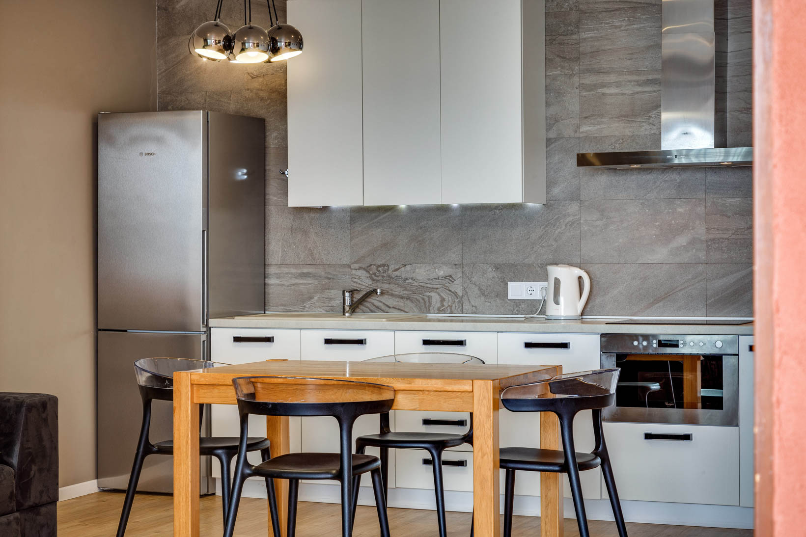 вешалка , диван раскладной , зеркало , кровать двуспальная , кухонная мебель , прикроватные тумбочки , стол , стулья , шкаф