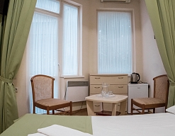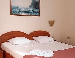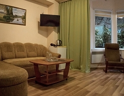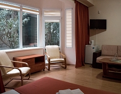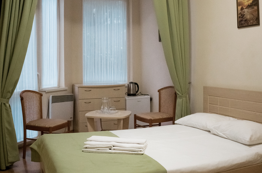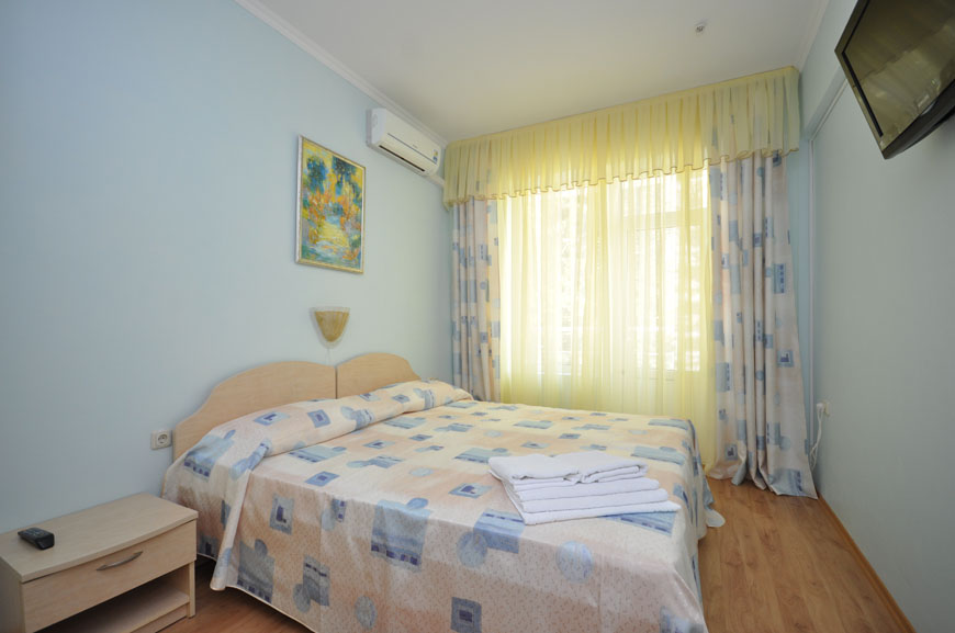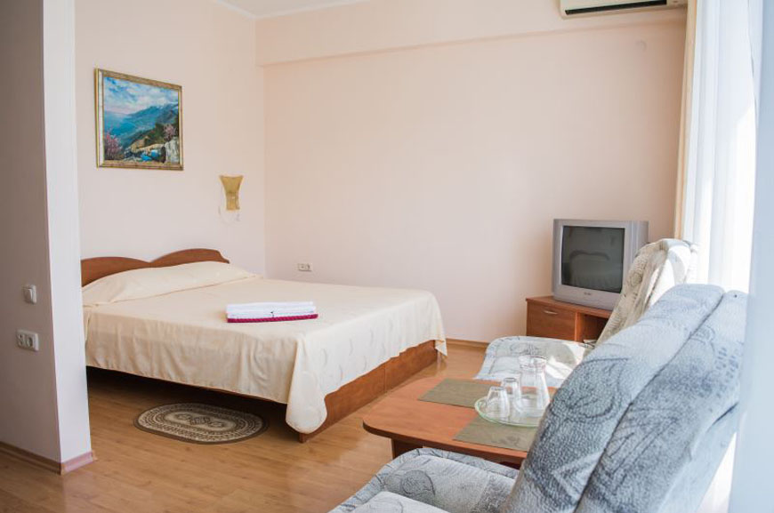 Номера мини-гостиницы в Алупке оборудованы всем необходимым для отдыха: телевизорами, кондиционерами, шкафом, столом. Всем постояльцам доступны холодильник, ванная с теплыми полами и современные мебельные гарнитуры.