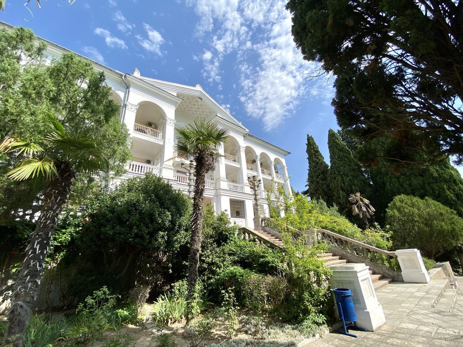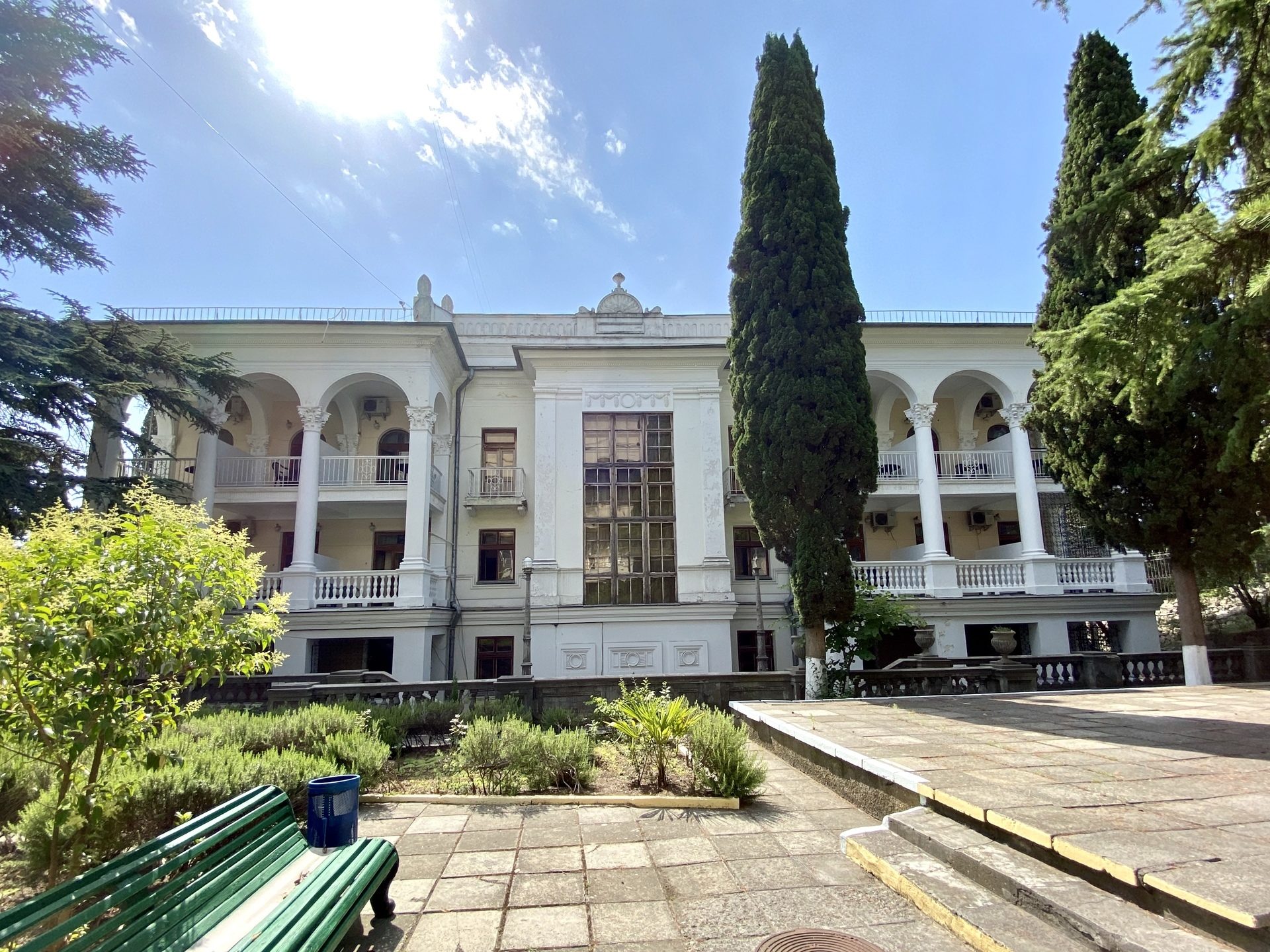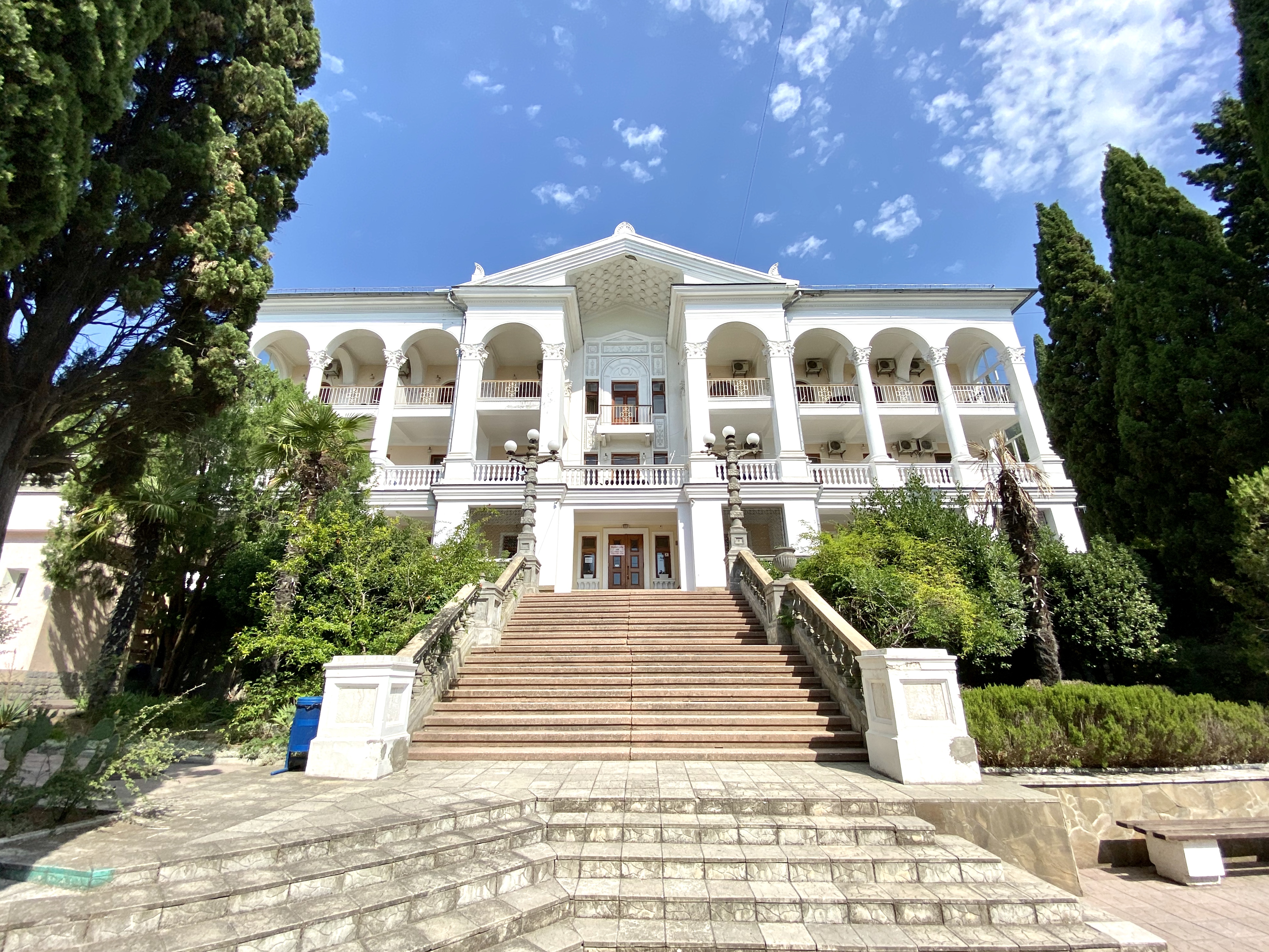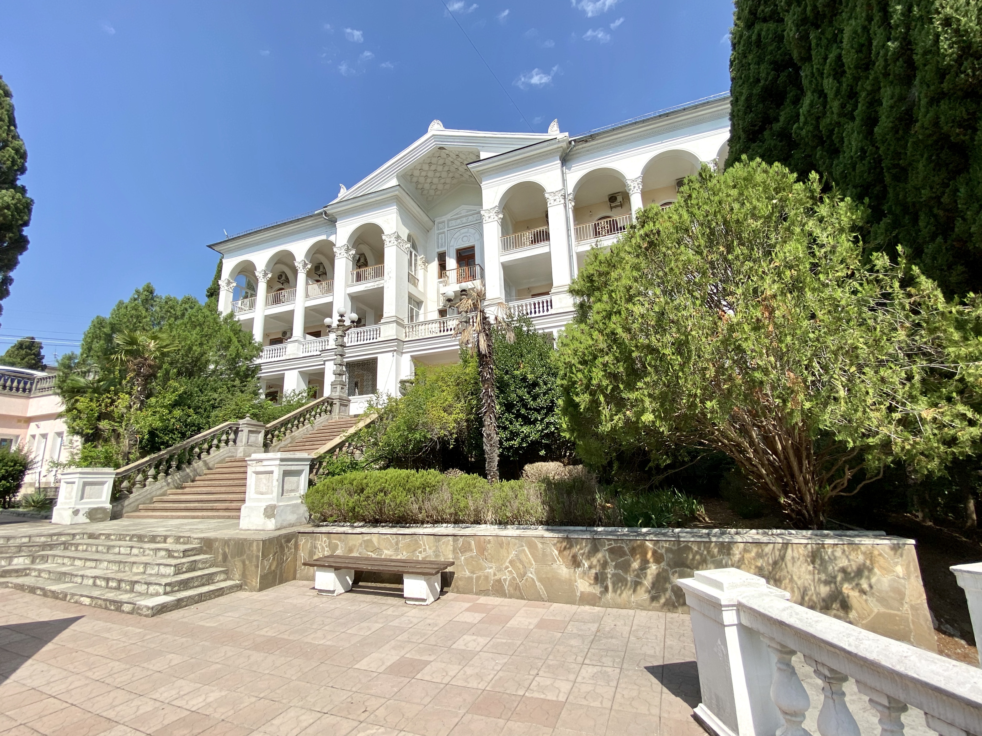 Отель занимает красивый трехэтажный особняк с белоснежными колоннами и балюстрадами, расположенный среди зеленого парка с кипарисами и пальмами.