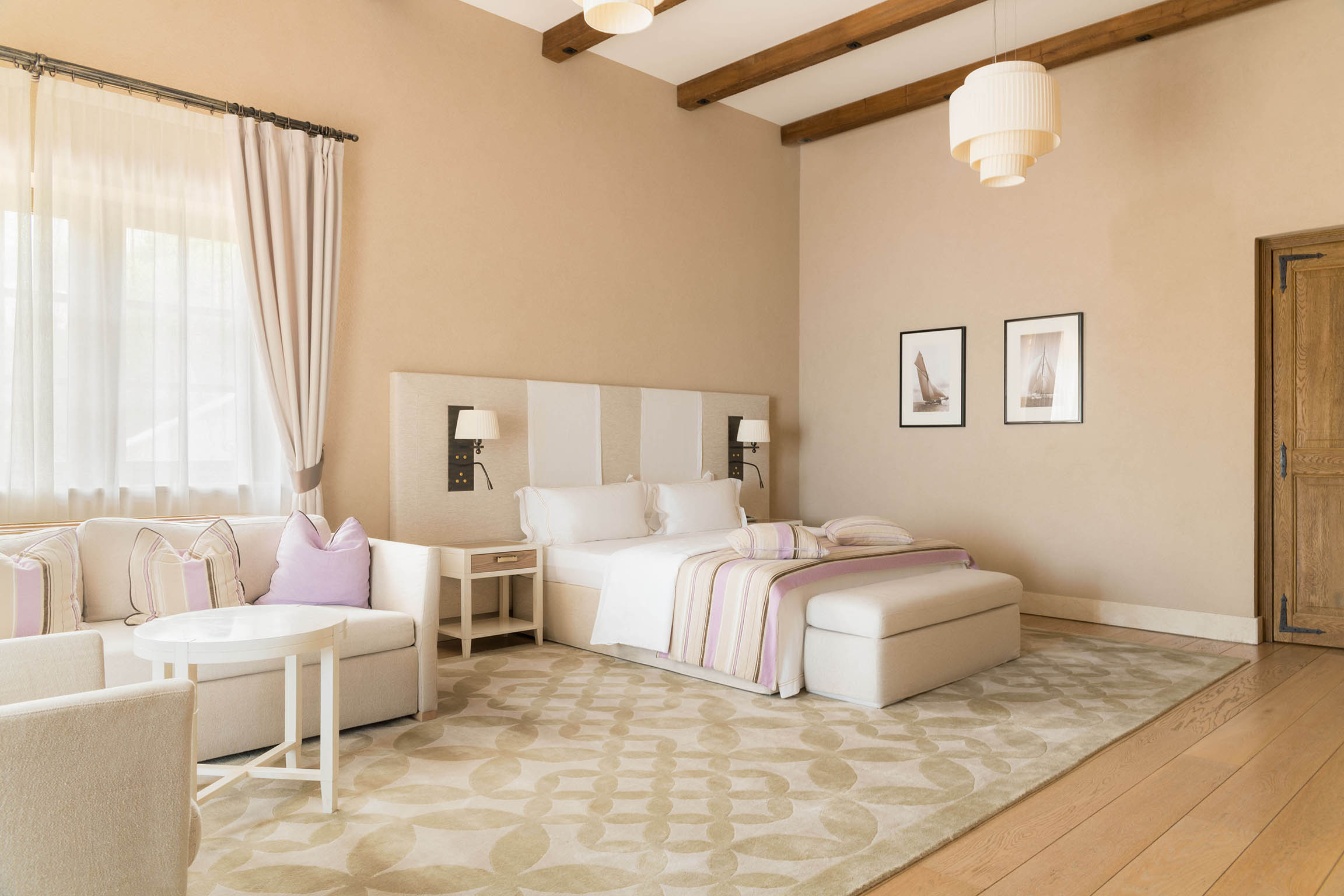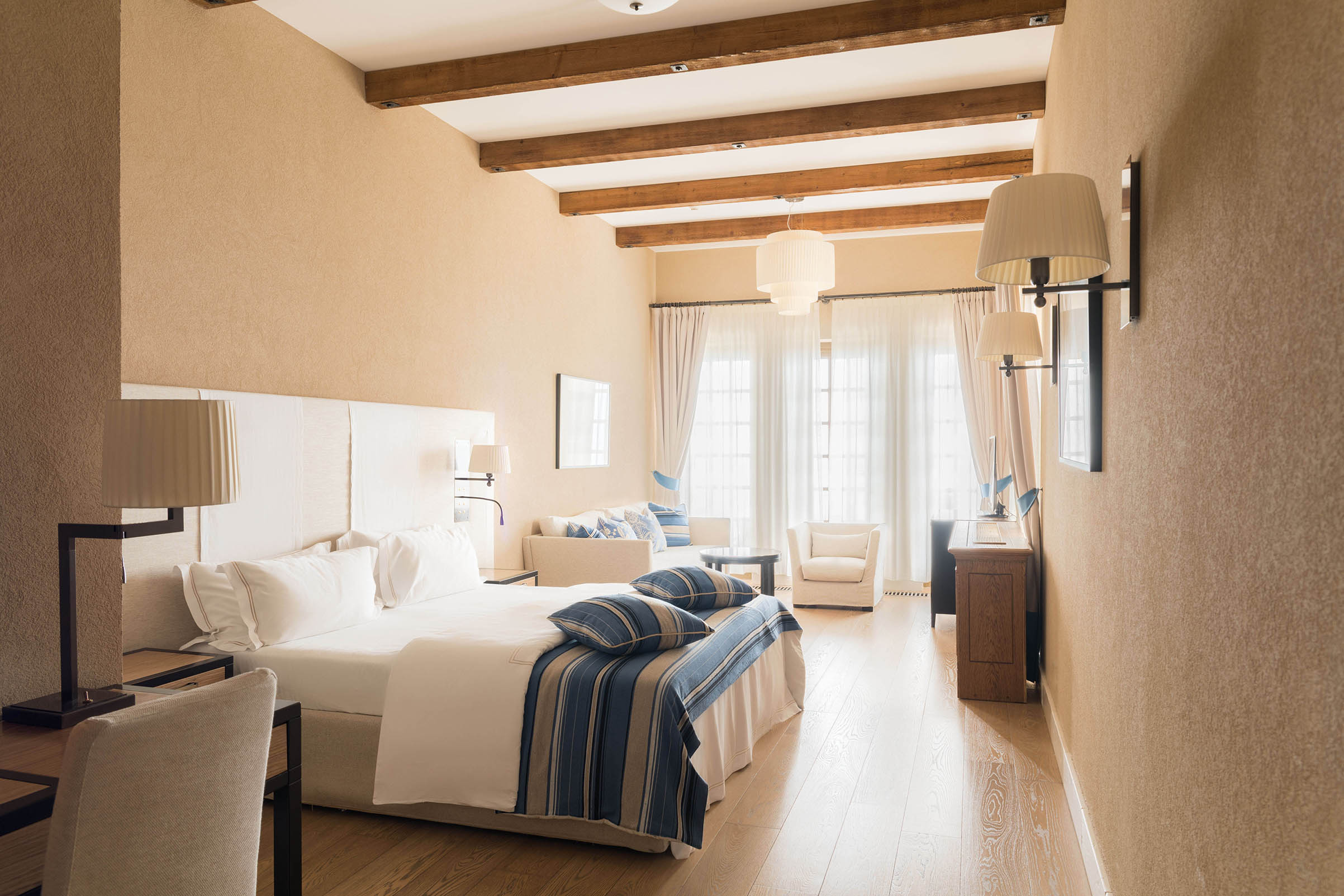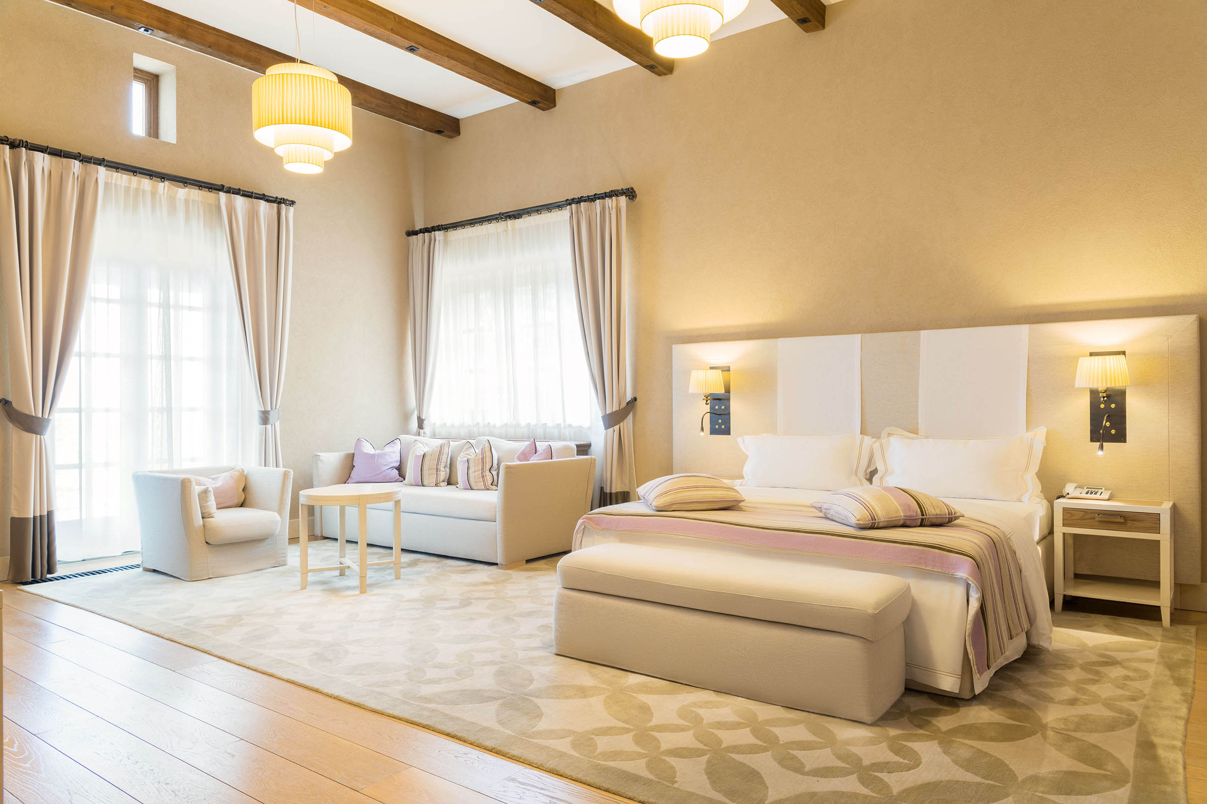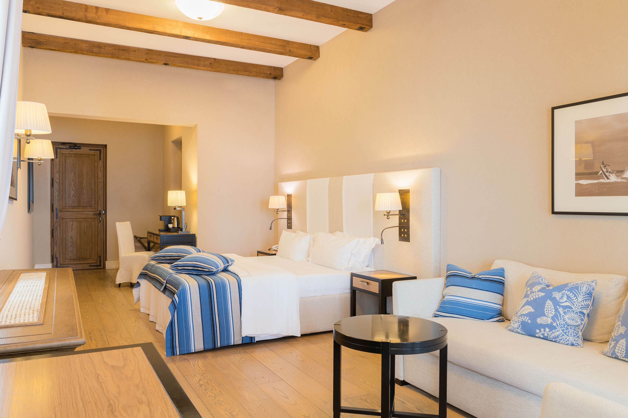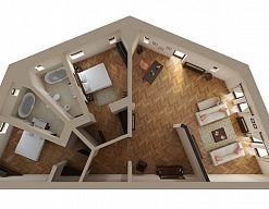 вешалка, гардеробная, диван, зеркало, кресла, кровати односпальные /одна двуспальная кровать, прикроватные тумбочки, стол, стулья, шкаф