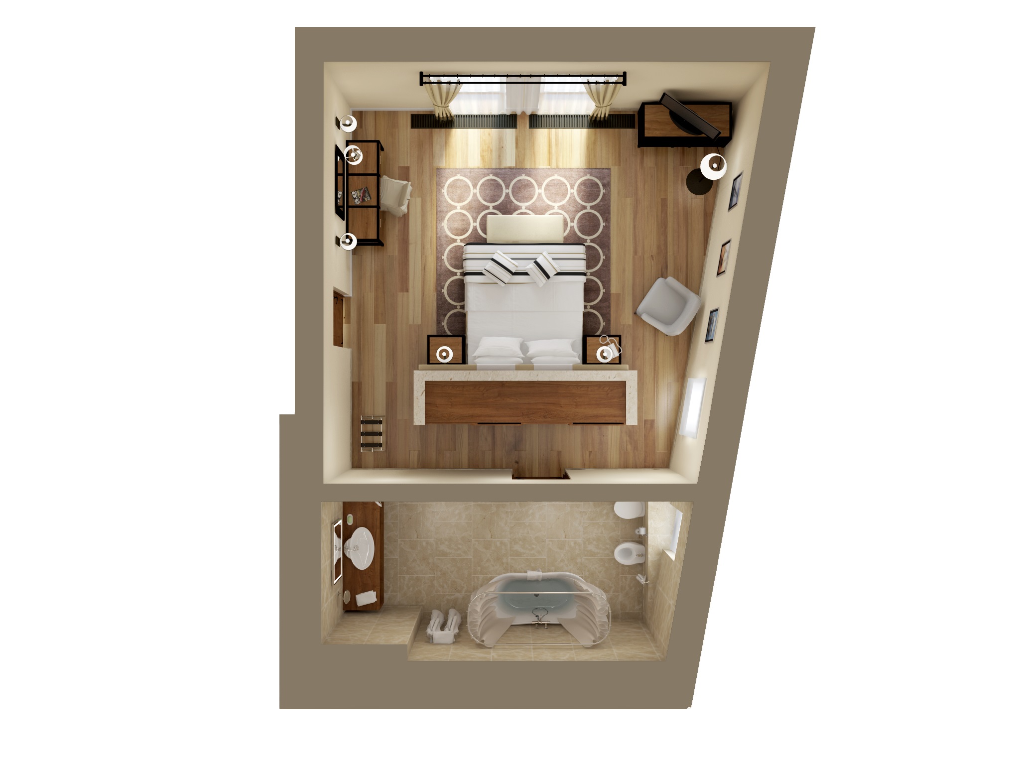 вешалка, зеркало, кресло, кровати односпальные /одна двуспальная кровать, прикроватные тумбочки, стол, стулья, шкаф