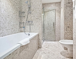 с душевой кабиной, тапочки, фен, халат