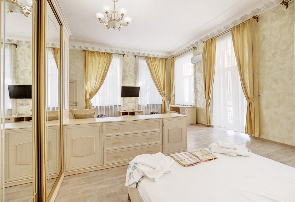 вешалка, диван, зеркало, кровать двуспальная, прикроватные тумбочки, стол, стулья, шкаф