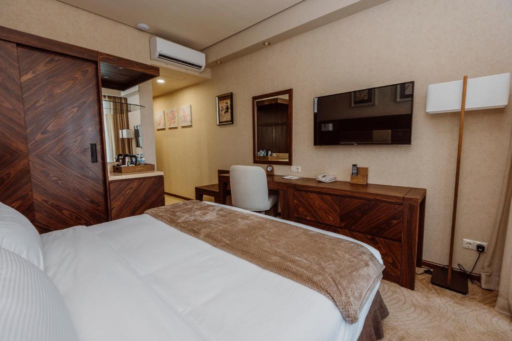 Наши стильные и просторные номера созданы для вашего полного комфорта и удовлетворения всех ваших потребностей. Каждый номер оформлен с любовью к деталям, предлагая современный дизайн и уютную обстановку. У вас будет все необходимое для приятного пребывания, включая удобную мебель, собственную ванную комнату, телевизор, бесплатный Wi-Fi и мини-бар. Вы сможете отдохнуть, расслабиться и насладиться тишиной и спокойствием в наших номерах.