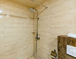 с душевой кабиной, тапочки, туалетные принадлежности, халат