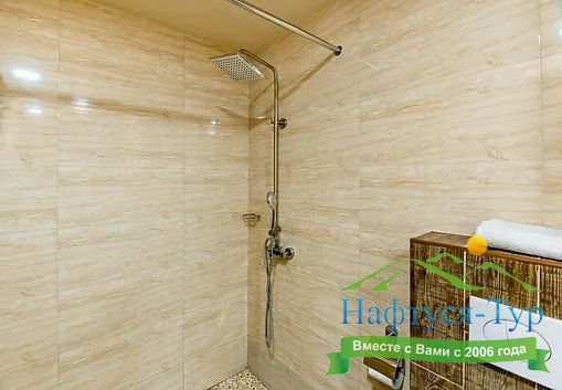 с душем, тапочки, туалетные принадлежности, фен