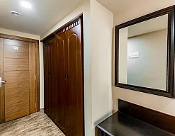 вешалка, зеркало, кровати односпальные /одна двуспальная кровать, прикроватные тумбочки, стол, стулья, шкаф