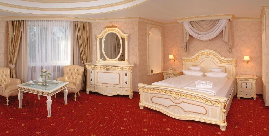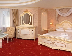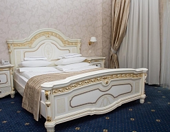 зеркало, ковровое покрытие, кровать двуспальная, прикроватная тумбочка, столик журнальный, стулья, шкаф